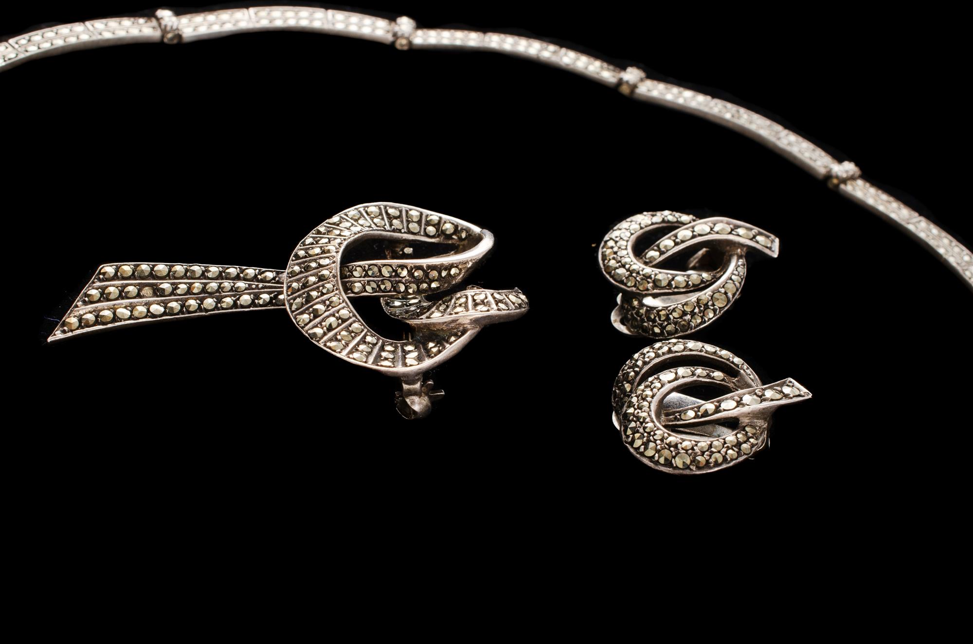 Silver Marcasite Necklace, Brooch & Earrings Articulated necklace, clip on earring & brooch. 2 stones missing, 1 to necklace & 1 to earring. Total weight 55.99g Provenance: Deceased Estate, Sydney.Estimate $60-100