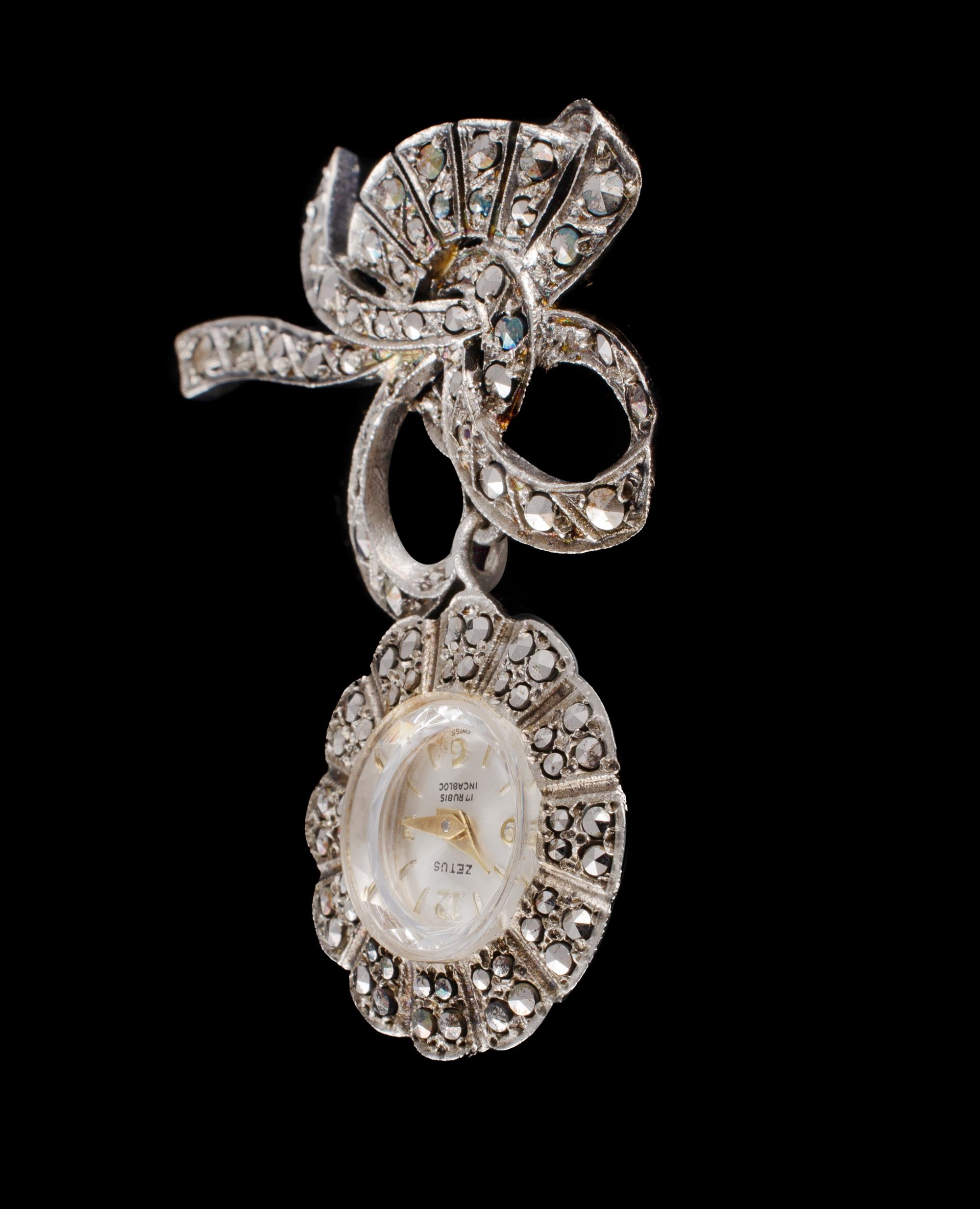 Two Silver & Marcasite Watches Wristwatch 17 jewel 'Alpinex' (one stone missing); & brooch watch 17 jewel 'Zetus' Provenance: Deceased Estate, Sydney.Estimate $40-70