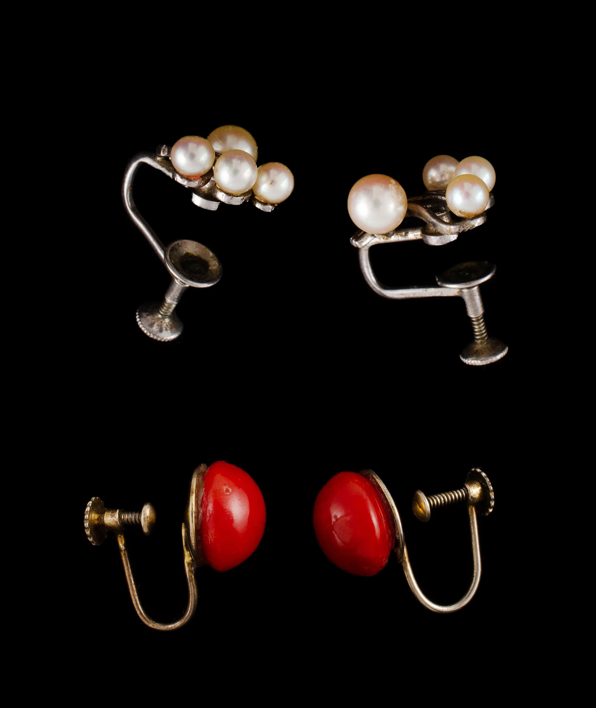 4 Prs Silver, Pearl, Silver Gilt & Coral Earrings Incl. quadruple pearl 'Mikimoto' screw on earrings; pair single pear; & 2 pairs coral earrings in silver gilt, one screw on, one clip on. Total weight approx. 16.63g Provenance: Deceased Estate, Sydney. Estimate $50-90