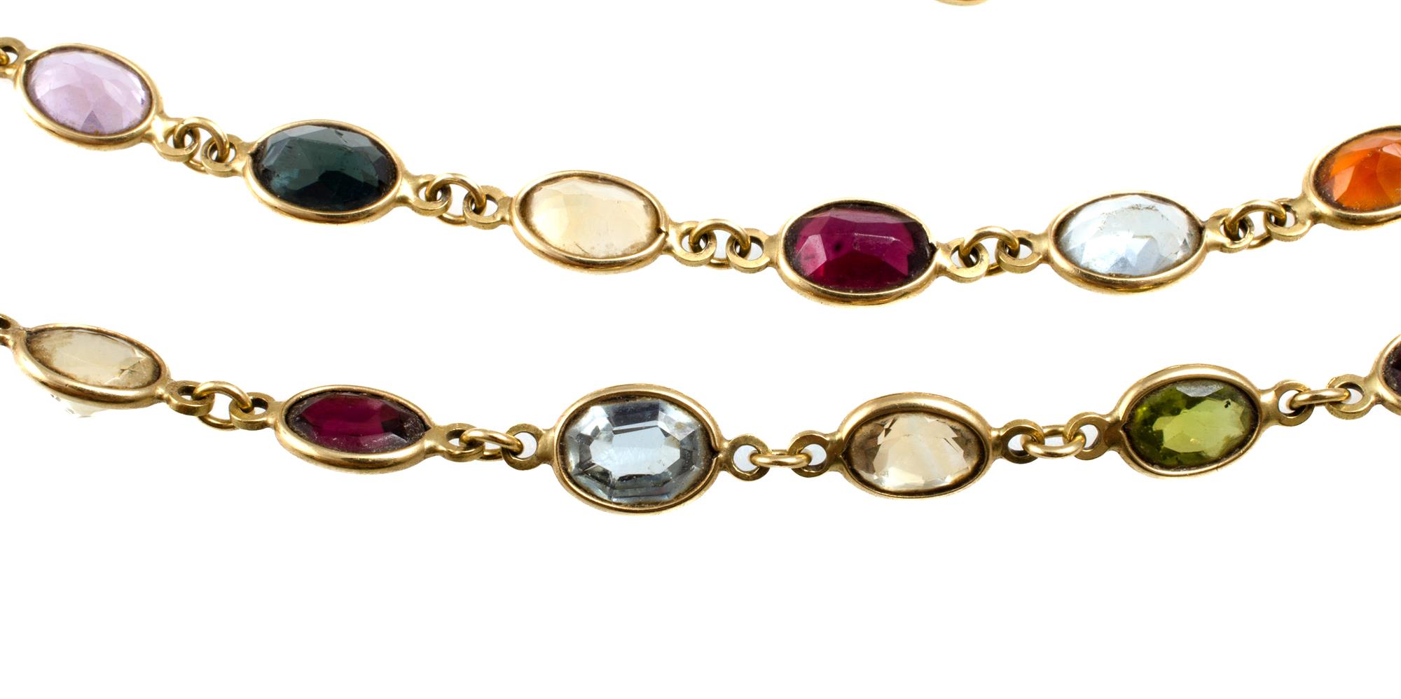 18ct Yellow Gold Multi Gem Necklace & Bracelet Rim set with topaz, garnet, citrine, & amethyst necklace & bracelet. Bracelet missing 2 stones. Length 80cm (necklace) & 21cm (bracelet) Total weight 29.37g Provenance: Deceased Estate, Sydney.Estimate $400-800