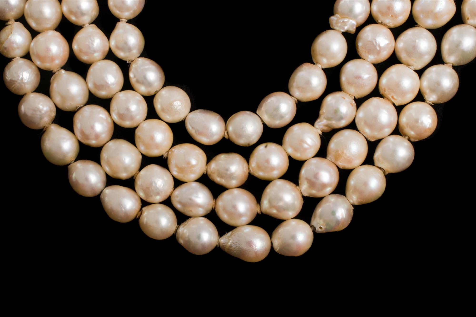 Twin Strand Semi Baroque Necklace 7 to 7.5mm semi baroque cultured pearls with silver pearl & emerald clasp. Length 86cm (2) Provenance: Deceased Estate, Sydney.Estimate $200-350