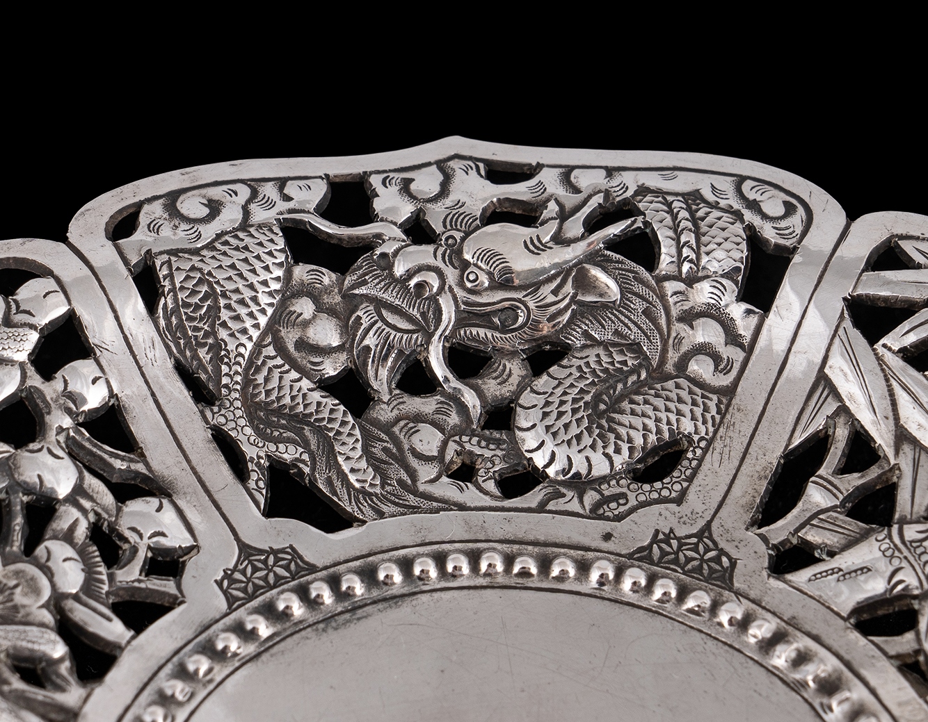 Chinese Silver Small Basket with Dragons Hallmarked 'Silver' with two other character marks. D13cm, W117g Estimate $100-150