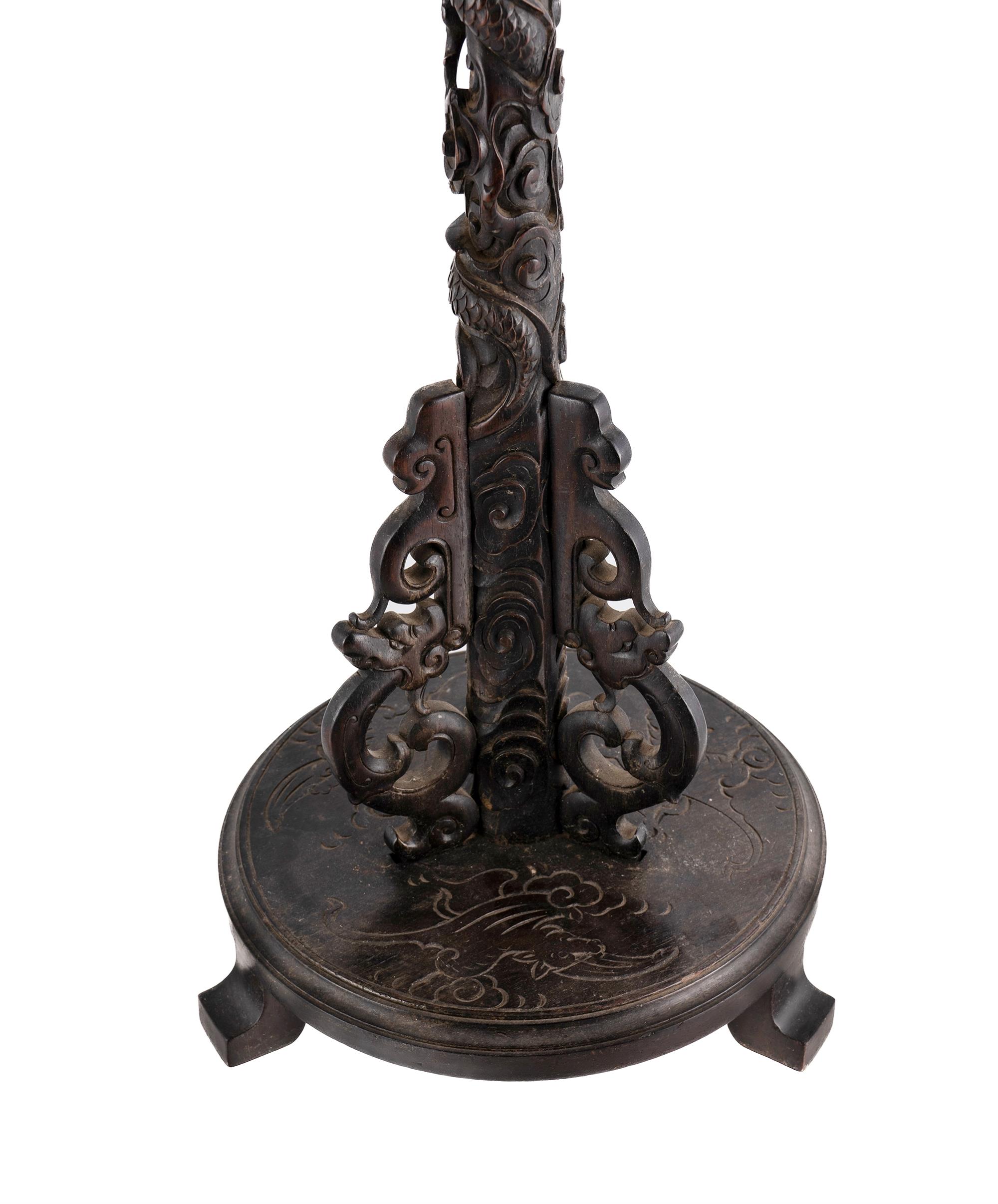 Chinese Export Carved Rosewood Table Lamp A/F silk shade perished, loss to dragon's horns. (H75cm) Estimate $100-200