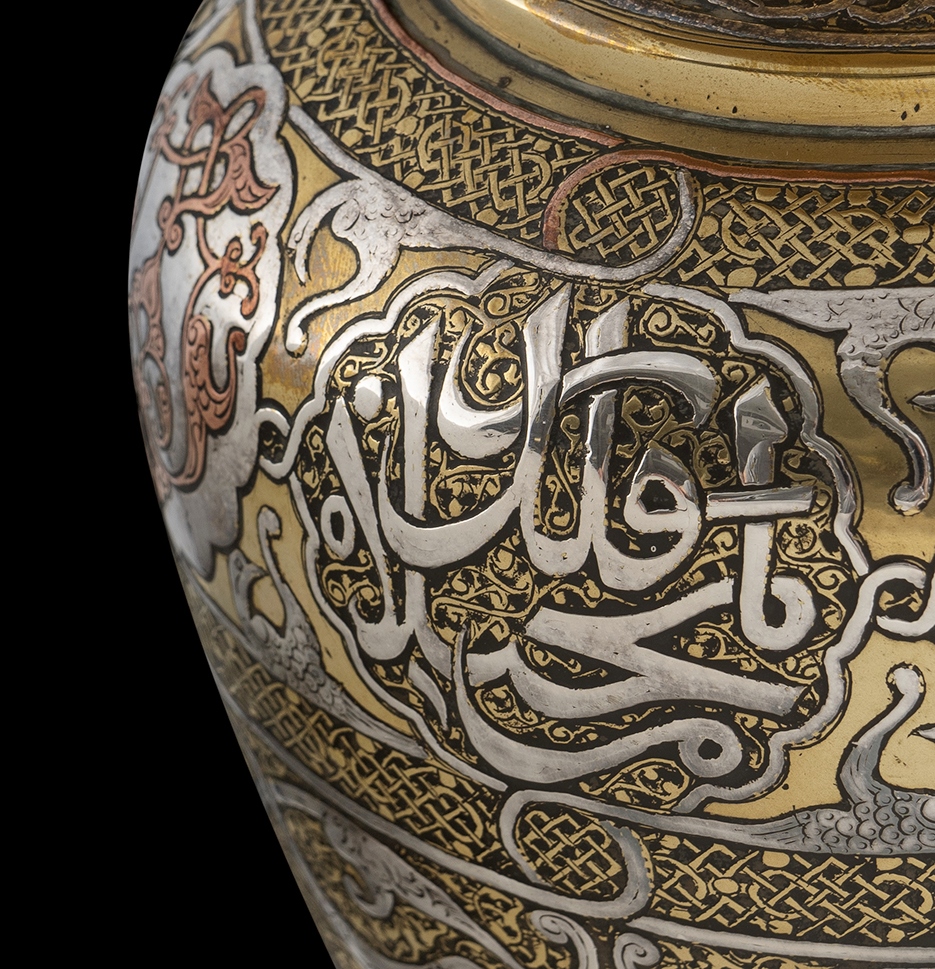 Pr Islamic Cairo Ware Mamluk Revival Silver & Copper Inlaid Engraved Brass Vases, c.1900 (H31.5cm)Estimate $300-600