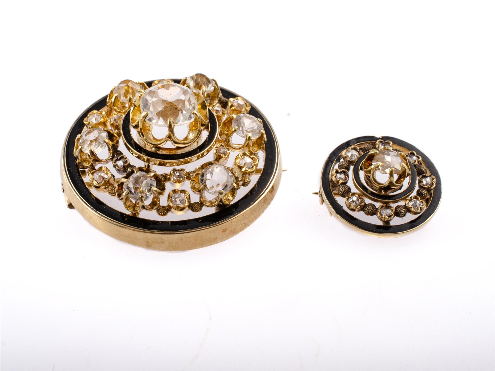 2 14ct Yellow Gold Circular Mourning Brooches The smaller set with a centre Dutch, rose cut diamond with rose cut & old European cut diamonds & black enamel bands around (0.27ct). The larger, set with 12 old European cut diamonds & seven white stones (old European cuts, bar one replacement (0.35ct). Total diamond around 0.62ct Weight 3.38g (small) & 14.47g (large) Estimate $450-750