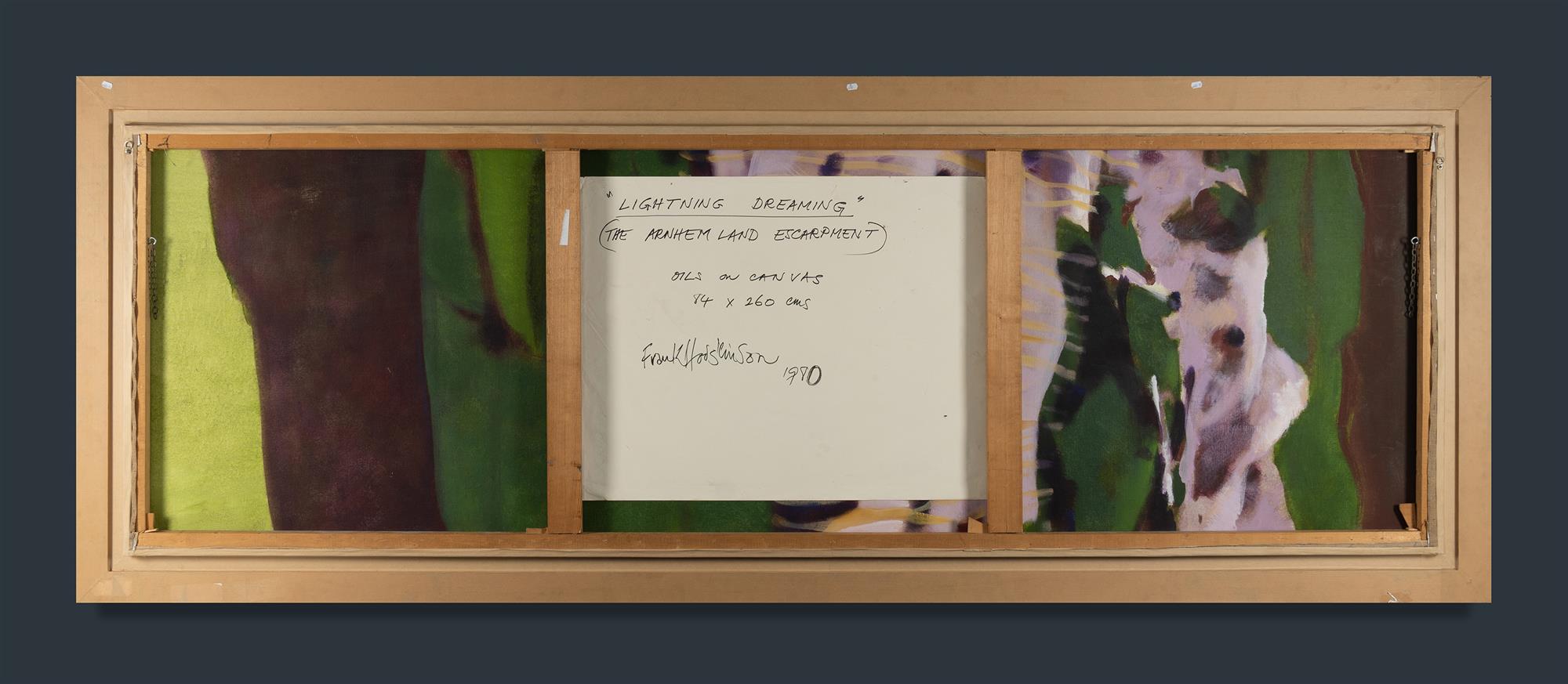 HODGKINSON, Frank George (1919-2001) 'Lightning Dreaming' [The Arnhem Land Escarpment], 1980. Oil on Canvas 84x260cmEstimate $1,000-3,000