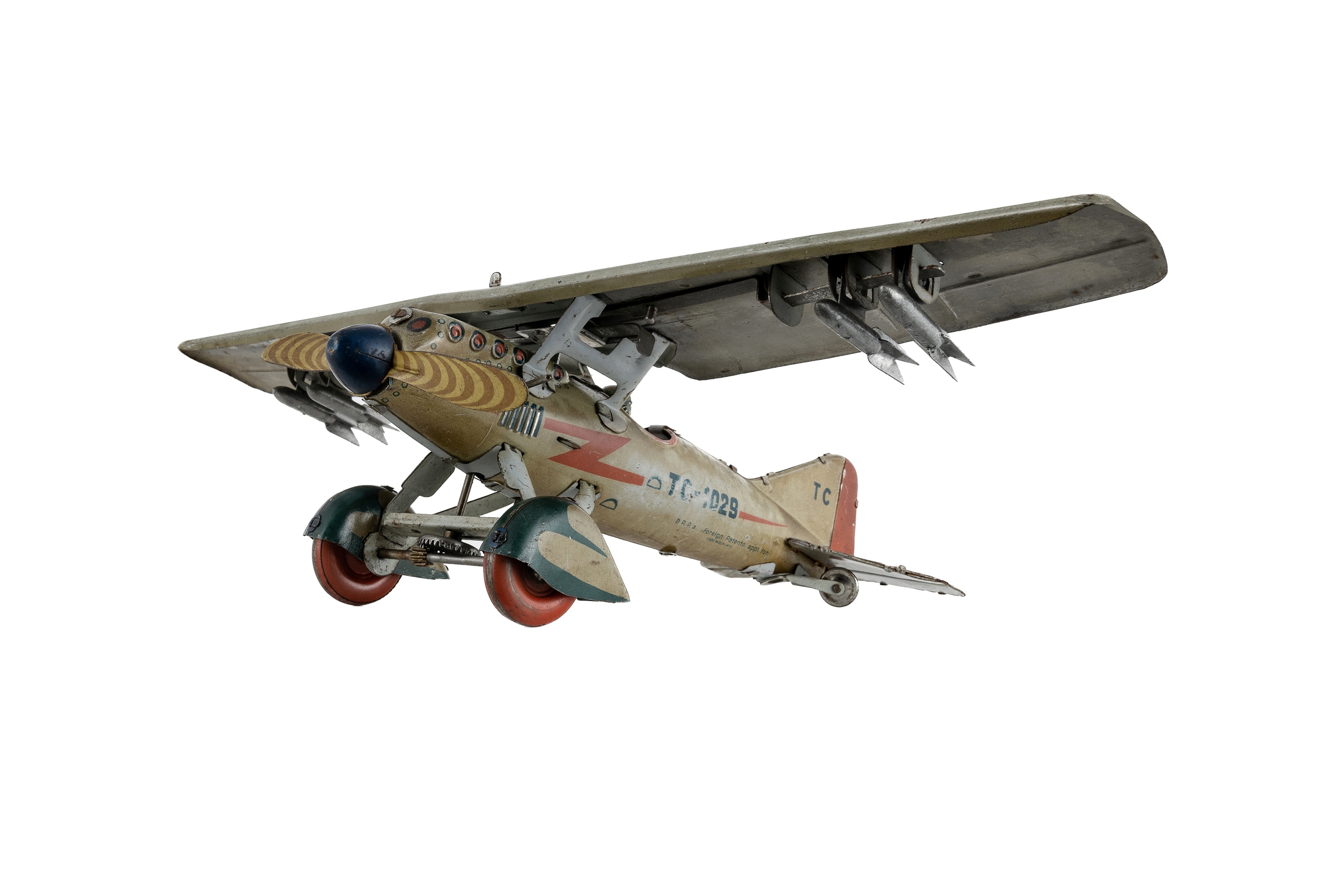 Tippco Lithographed Tinplate Aeroplane. Monoplane clockwork bomber with bomb dropping mechanism, c.1935. Some paint darkening to fuselage, otherwise good. L26cm (2Piv)Estimate $500-1,000