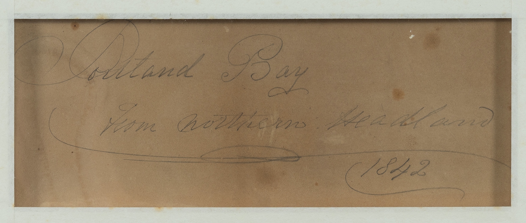 GILL, Samuel Thomas (1818-1880) 'Portland Bay from Northern Headland,' 1842. Initialled 'S.T.G.' lower left; inscribed with title verso. W/Clr 13.5x30cm PROVENANCE: Private collection, NSW.Estimate $7,000-10,000