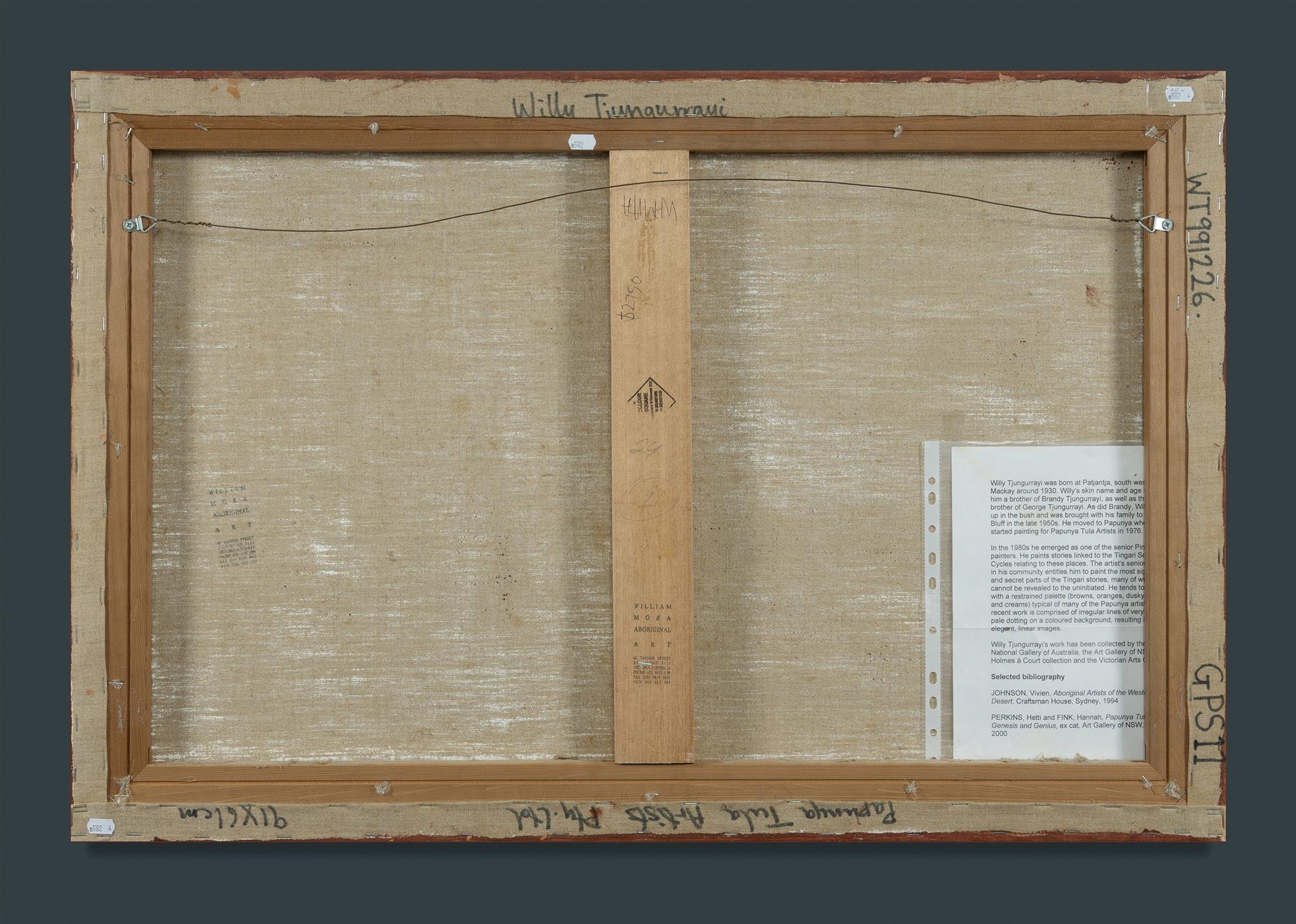 TJUNGURRAYI, Willy (Aboriginal c.1932-2018) Tingari Dreaming, 1999. Acrylic on Linen 91.5x61.5cm PROVENANCE: Papunya Tula Artists Pty Ltd, cat #WT991226; William Mora Aboriginal Art, Melbourne (stamp verso); private collection, NSW.Estimate $700-1,200