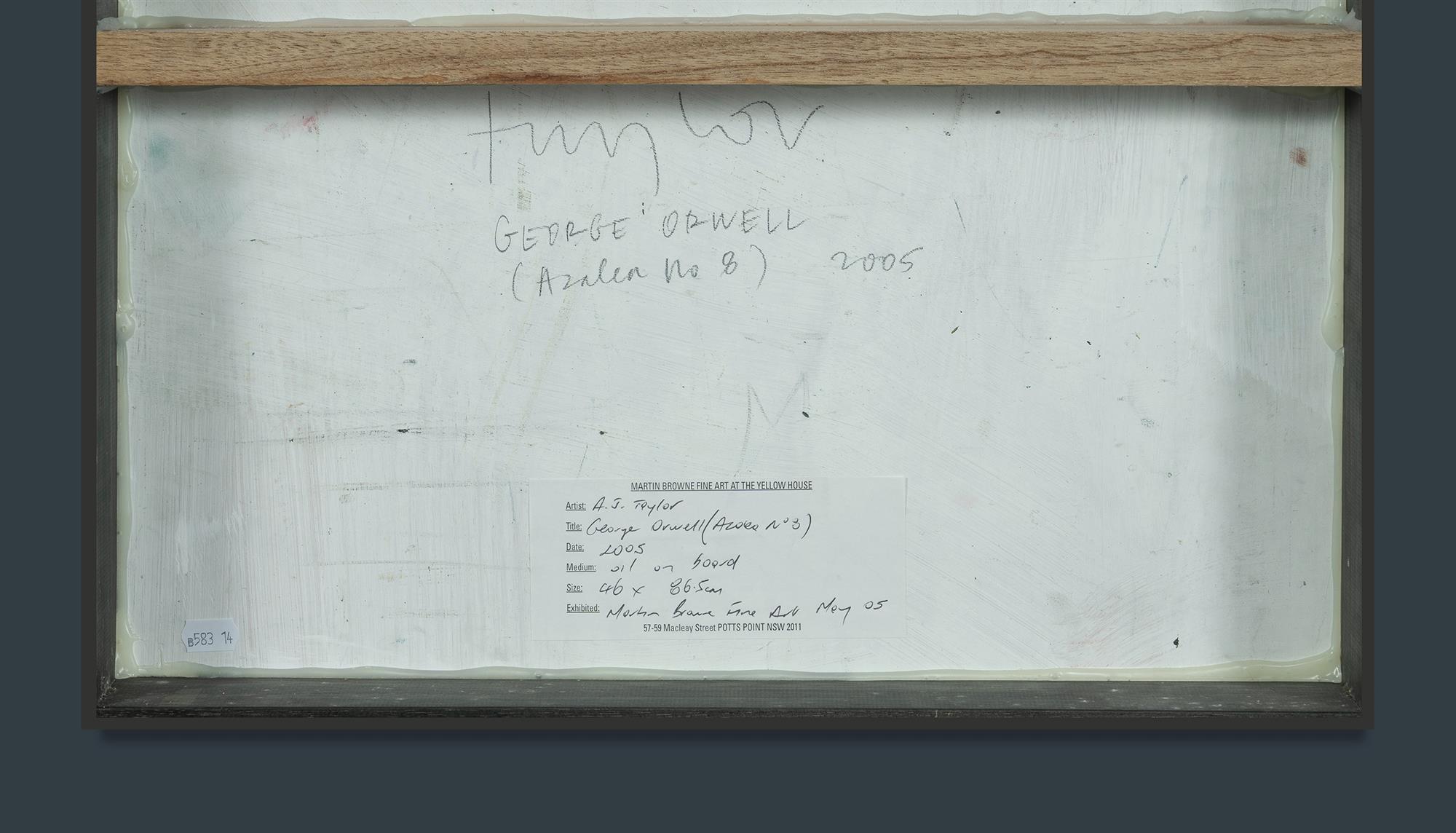 TAYLOR, A J (b.1969) 'George Orwell (Azalea no. 8)' 2005. Signed verso. Ex Martin Browne Fine Art at the Yellow House, Potts Point - exhibited May 2005 (label verso). Oil on Board 86.5x46cmEstimate $500-800