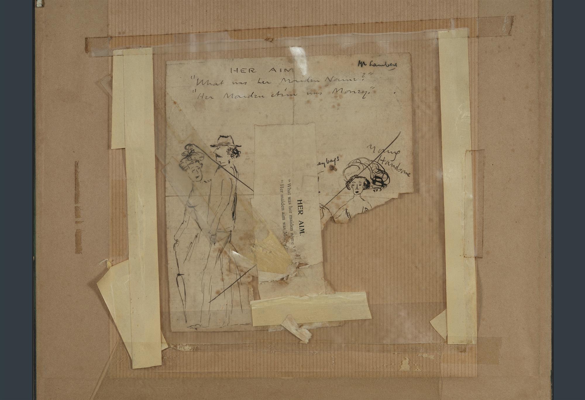 LAMBERT, George Washington (1873-1930) 'Her Aim / What was her Maiden Name? / Her Maiden Aim was Money,' Initialled and inscribed 'Paris' lower left. Ink & Gouache 23.5x14cmEstimate $600-1,000