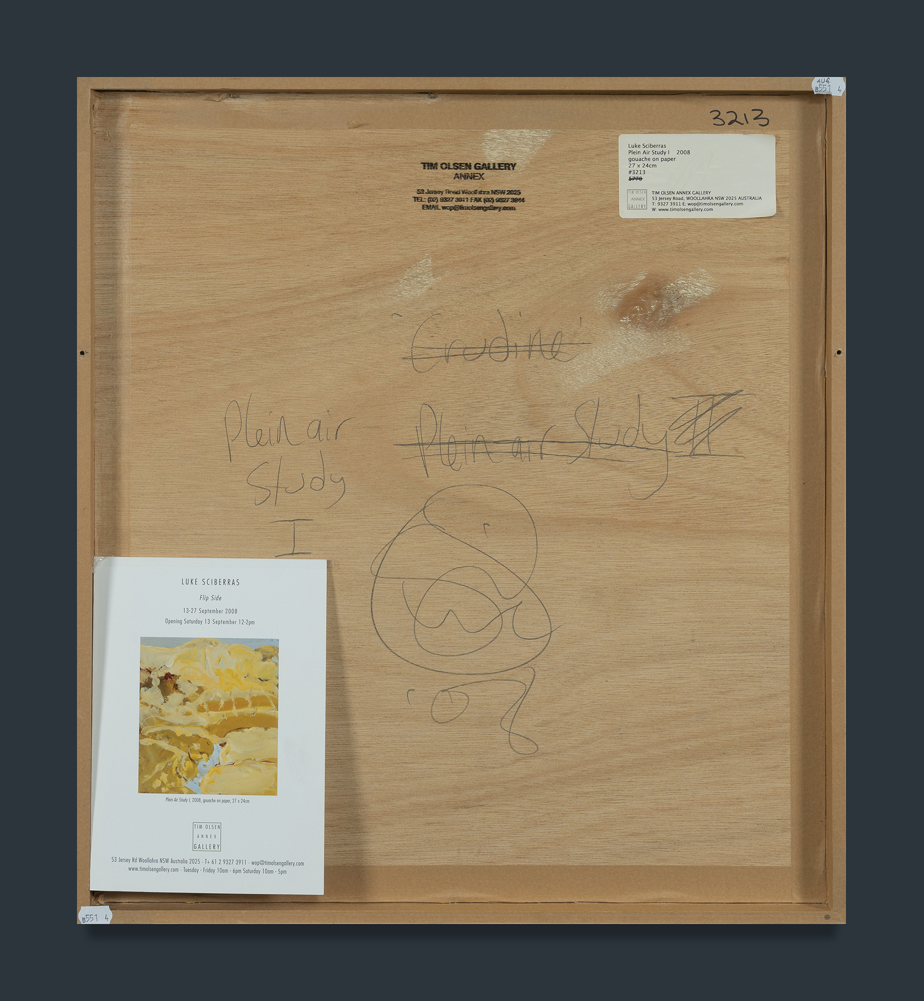 SCIBERRAS, Luke (b.1975) 'Plein Air Study I,' 2008. Signed/monogrammed verso. Gouache on Paper 27x24cm EXHIBITIONS: 'Luke Sciberras - Flip Side,' Tim Olsen Gallery Annex, Sydney, 13th-27th September 2008.Estimate $600-1,000
