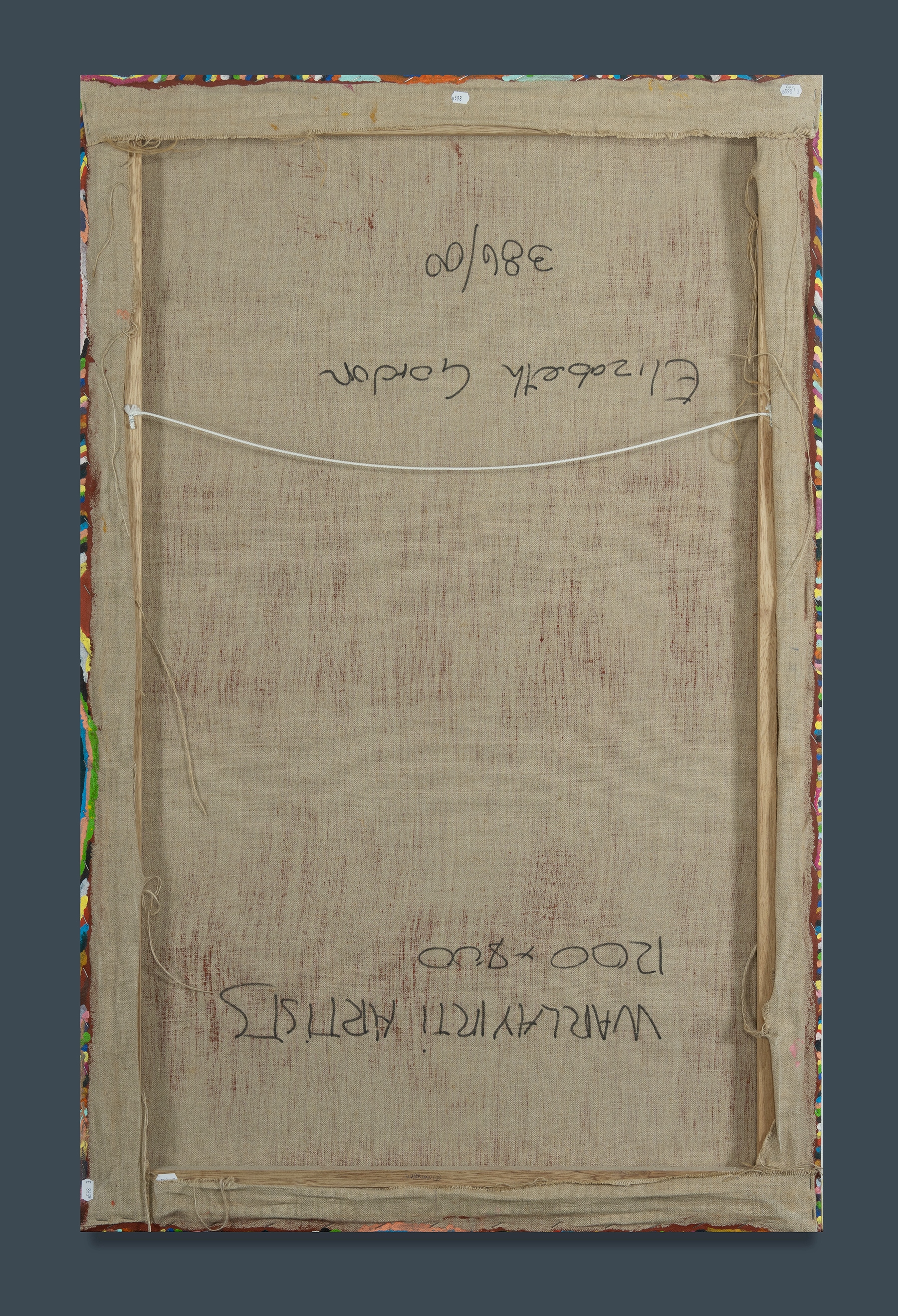 NAPALJARRI, Elizabeth Gordon (Aboriginal b.1954) 'Goonawarrawarra,' 2000. The work depicts the country close to Balgo, rockholes and creeks are full after wet season rains. Women are camping, dancing and telling stories. Acrylic on Linen 116x74.5cm PROVENANCE: Warlayirti Artists, cat #386/00 - certificate of authenticity available.Estimate $800-1,500
