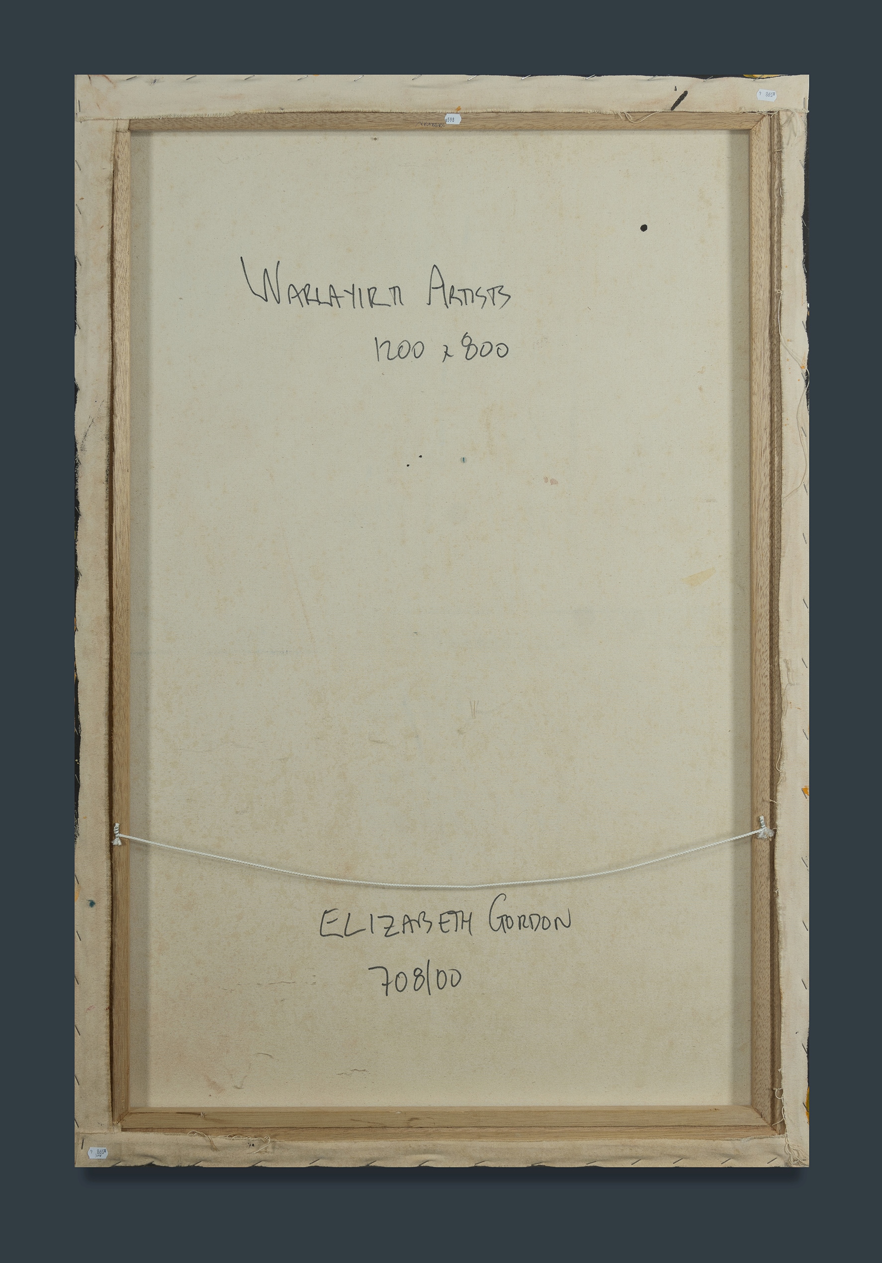 NAPALJARRI, Elizabeth Gordon (Aboriginal b.1954) 'Goonawarrawarra,' 2000. The work depicts the country close to Balgo, rockholes and creeks are full after wet season rains. Women are camping, dancing and telling stories. Acrylic on Canvas 118x79.5cm PROVENANCE: Warlayirti Artists, cat #708/00 - certificate of authenticity available.Estimate $800-1,500