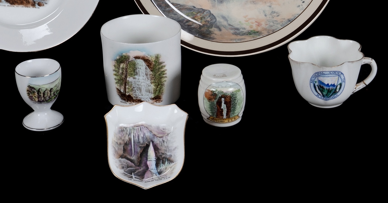 8 Blue Mountains Souvenir Items. Royal Doulton 'The Weeping Rock, Blue Mtns' plate; and five other porcelain items by Shelley and other makers featuring Jenolan Caves, The Three Sisters, Katoomba Falls and Bridal Veil Falls. (Rm4)Estimate $100-150