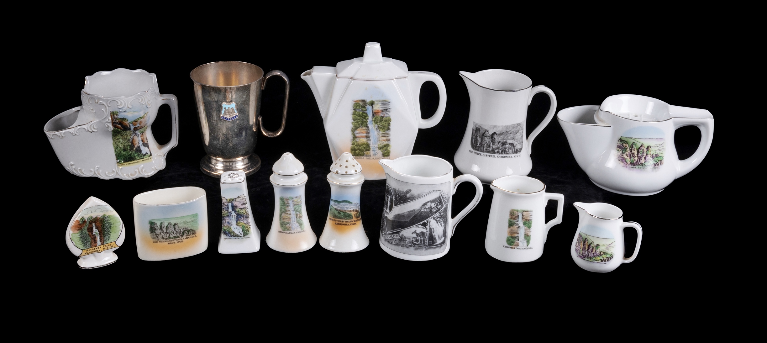 Quantity of Blue Mountains Souvenir Items. Silver plated mug, three various plated napkin rings, pair of porcelain salad servers, teapot (lid restored), two shaving mugs etc. Various makers. (Rm4)Estimate $100-200