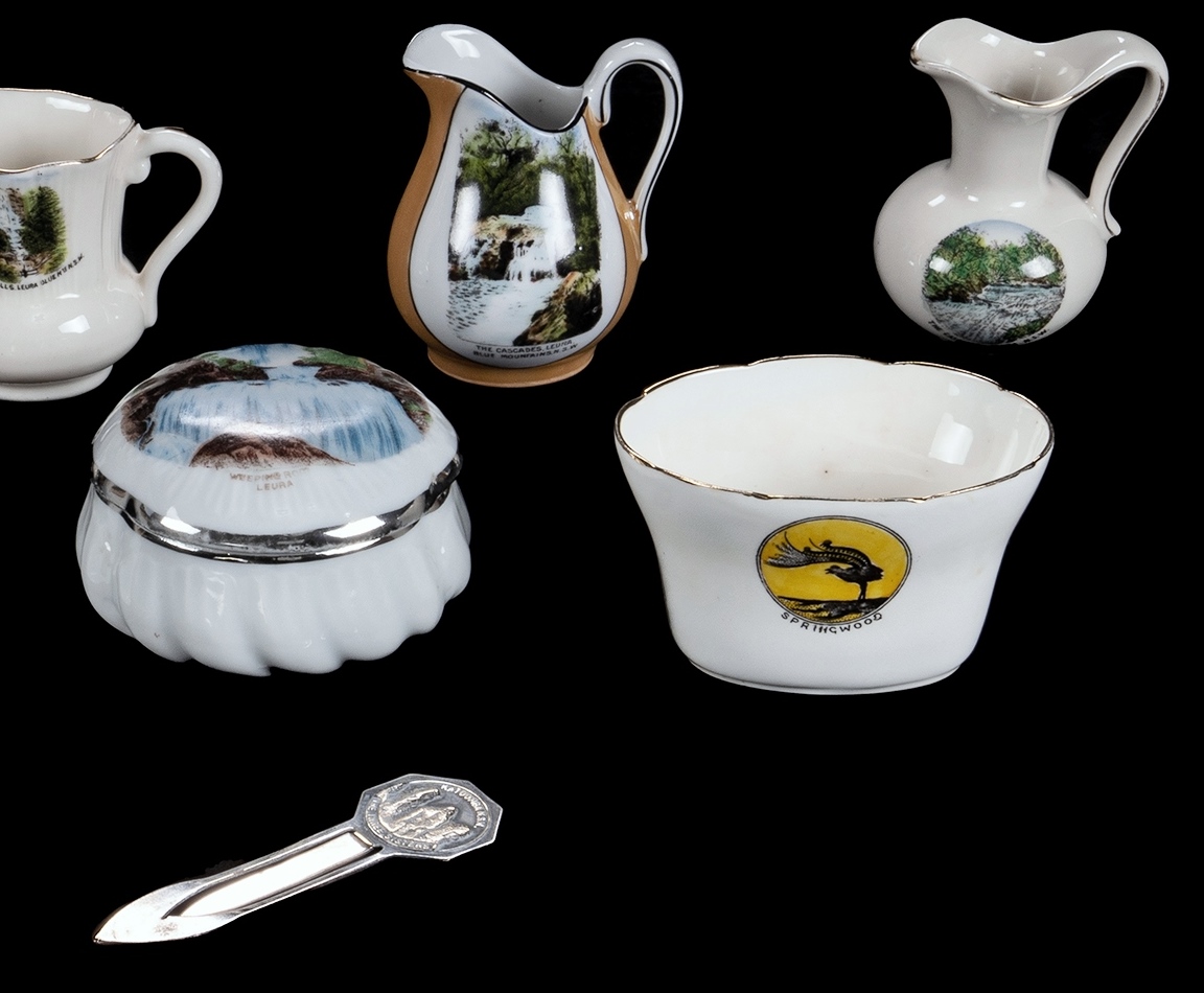 8 Blue Mountains Souvenir Items . Silver plated 'Three Sisters' bookmark, four jugs, pin dish and vase 'Leura', and a 'Springwood' bowl. Various makers. (Rm4)Estimate $80-150