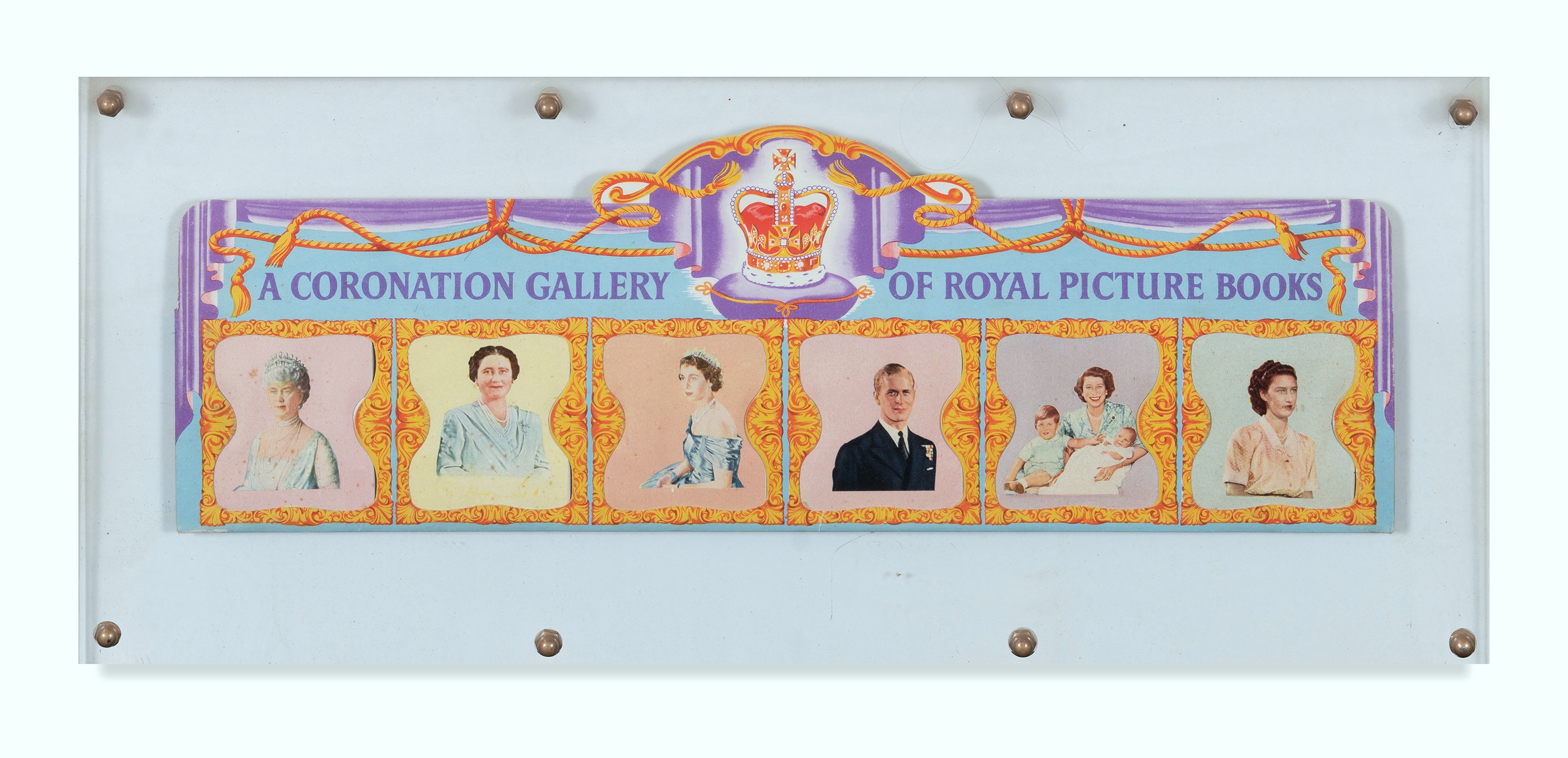 QEII Coronation Souvenir Display. Six Royal picture books in a die-cut cardboard display gallery with fold out stands verso. Published by Sampson Low 1954. (L47cm)Estimate $50-100