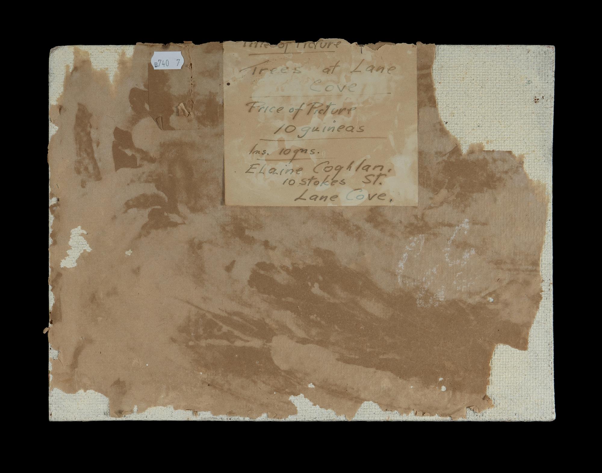 COGHLAN, Elaine (1897-1989) 'Trees at Lane Cove' Original artist's label verso. Oil on Board 25x33cm PROVENANCE: Belinda Foy, great niece of the artist.Estimate $200-400