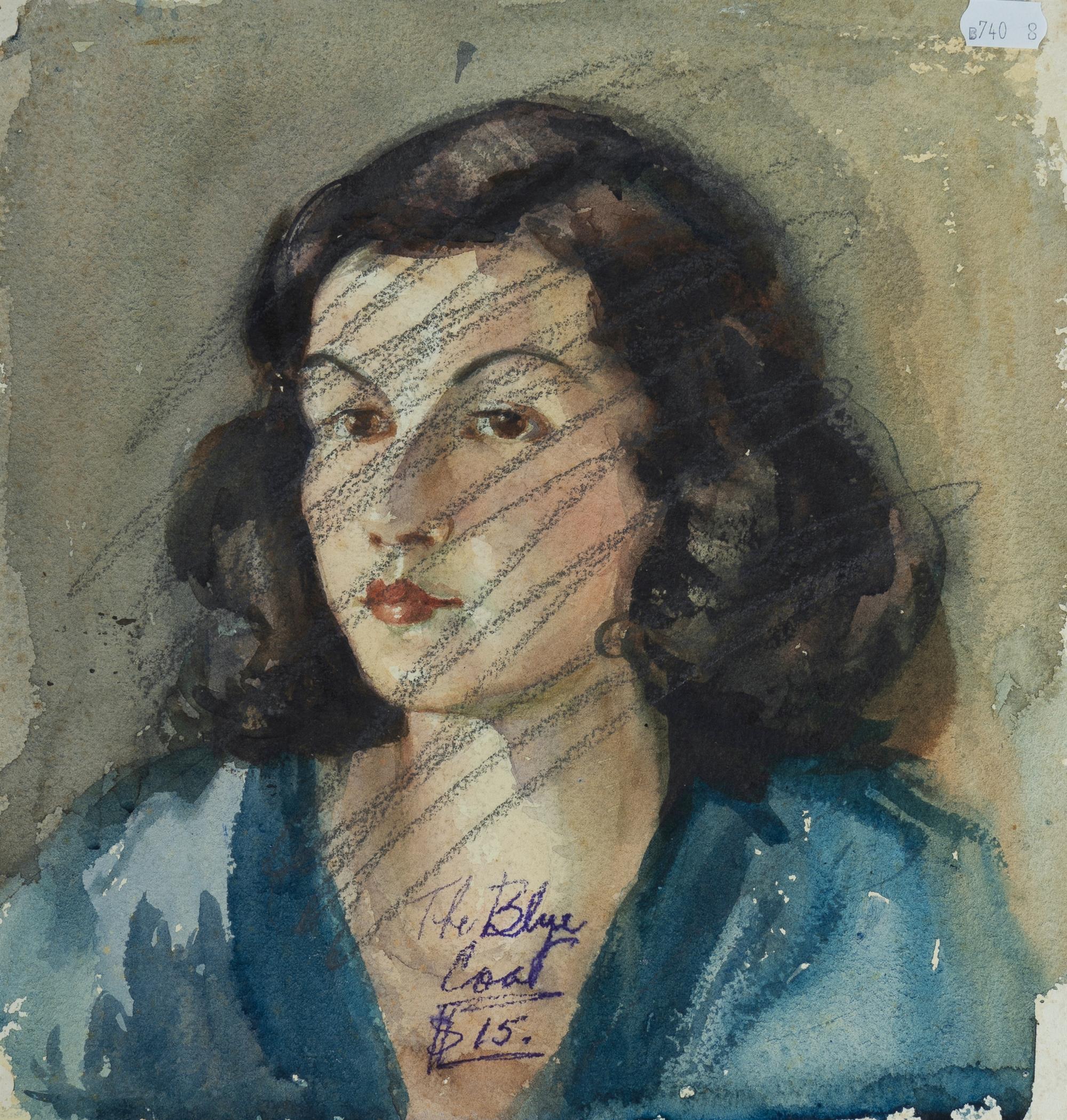 COGHLAN, Elaine (1897-1989) 'The Blue Coat' Unsigned. Cancelled sketch of a woman verso. W/Clr 29x28cm PROVENANCE: Belinda Foy, great niece of the artist.Estimate $200-400