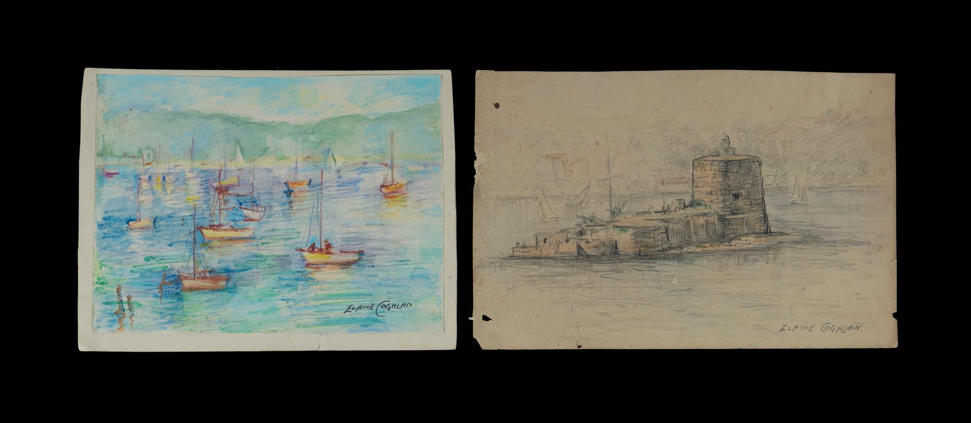 COGHLAN, Elaine (1897-1989) (4) Two Crayon Views of Boats in a Harbour (18x27cm, & 16x22cm); Australian Wildflowers, coloured pencils (21x17.5cm); & pencil sketch of Fort Denison (17.5x27cm) PROVENANCE: Belinda Foy, great niece of the artist.Estimate $150-250