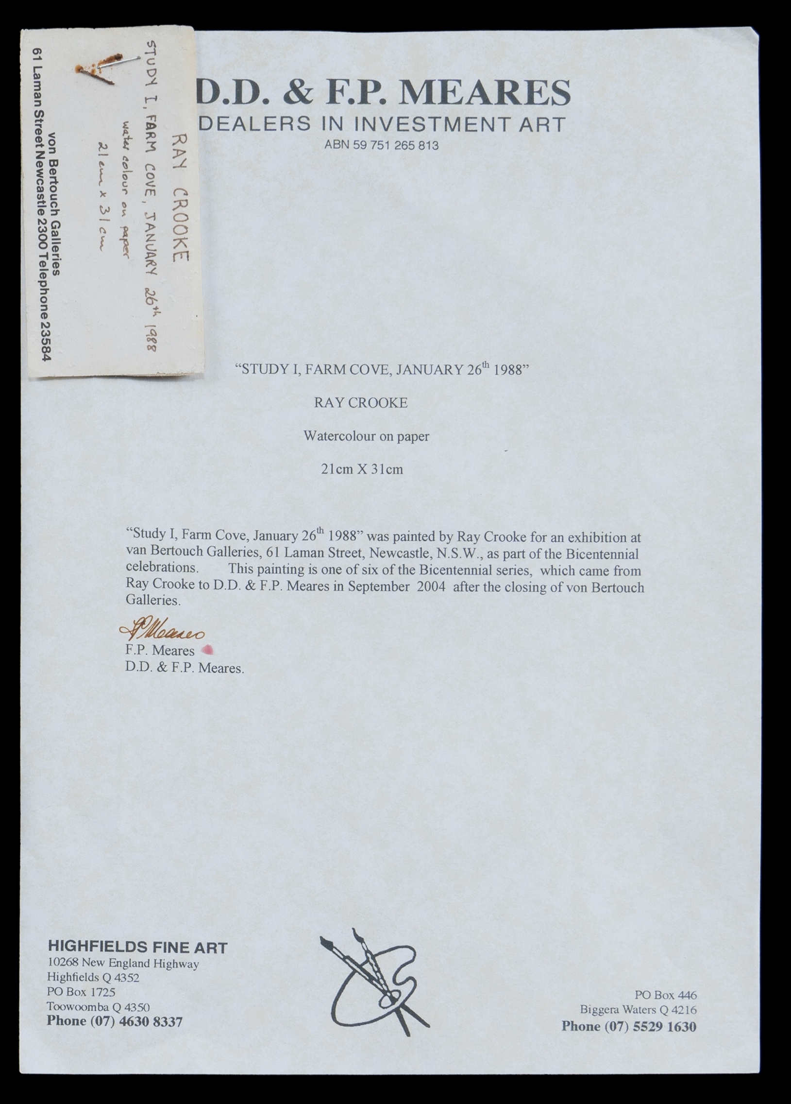 CROOKE, Ray (1922-2015) 'Farm Cove I' W/Clr & Gouache 21x31cm PROVENANCE: Seeing Sydney Harbour, Collection of Jim Haynes OAM and Robyn McMillan.Estimate $1,000-1,600
