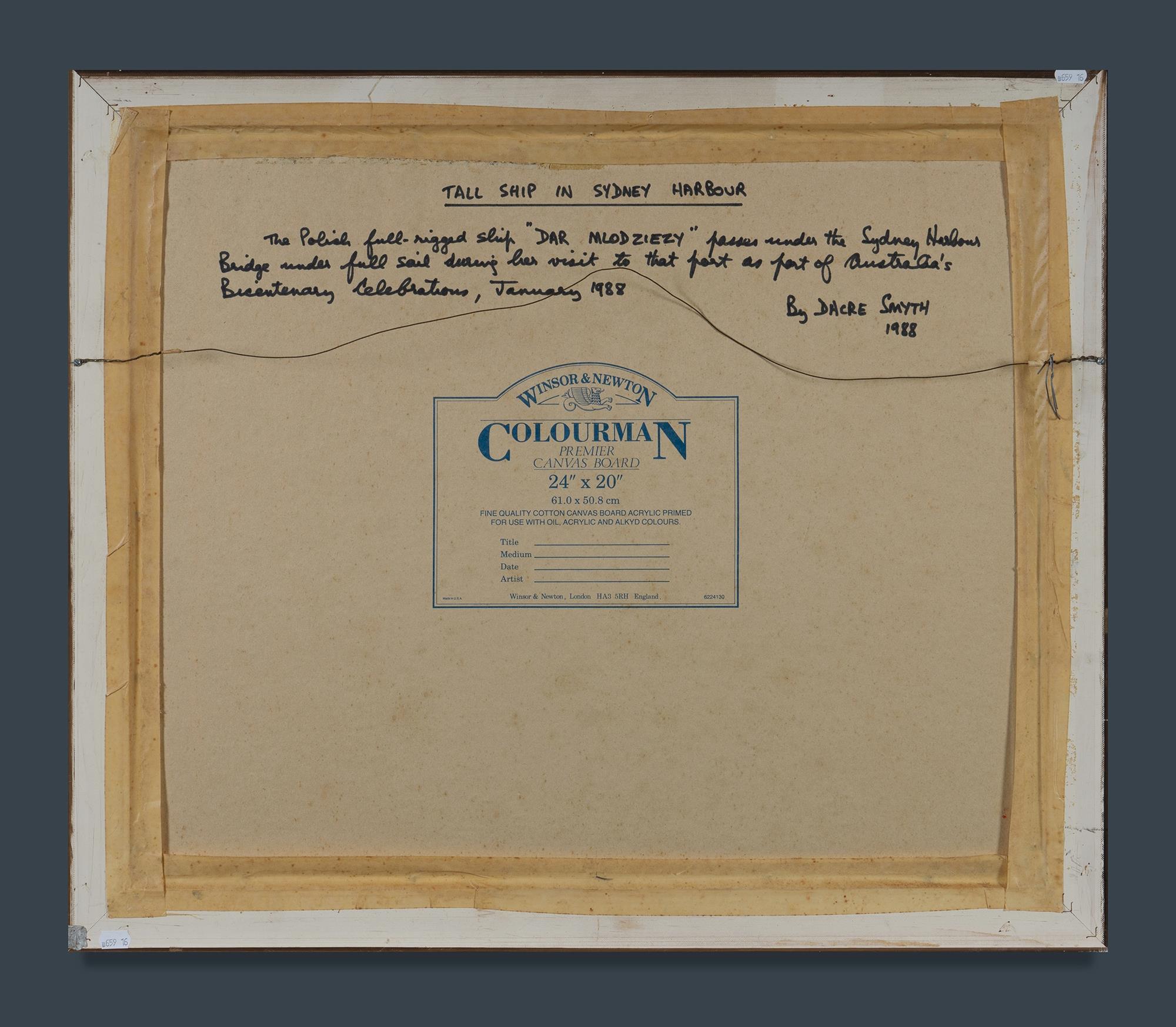 SMYTH, Dacre (1923-2008) 'Tall Ship (Dar Mlodziezy) in Sydney Harbour,' 1988. Oil on Canvas Board 49.5x59.5cm PROVENANCE: Seeing Sydney Harbour, Collection of Jim Haynes OAM and Robyn McMillan.Estimate $300-500