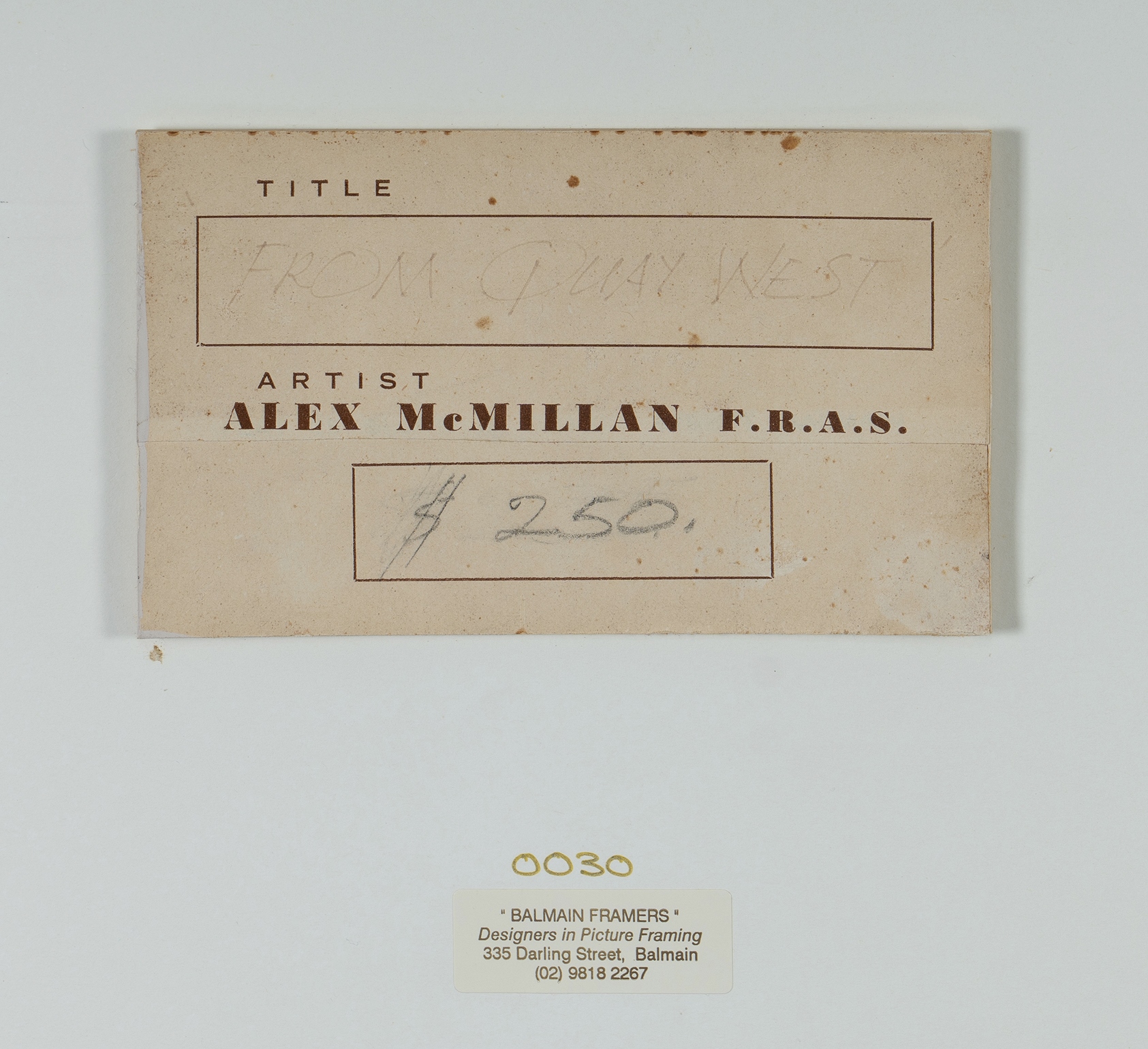 McMILLAN, Alex (1910-1987) 'From Quay West' Artist's label verso. W/Clr & Gouache 24x28.5cm PROVENANCE: Seeing Sydney Harbour, Collection of Jim Haynes OAM and Robyn McMillan.Estimate $150-250