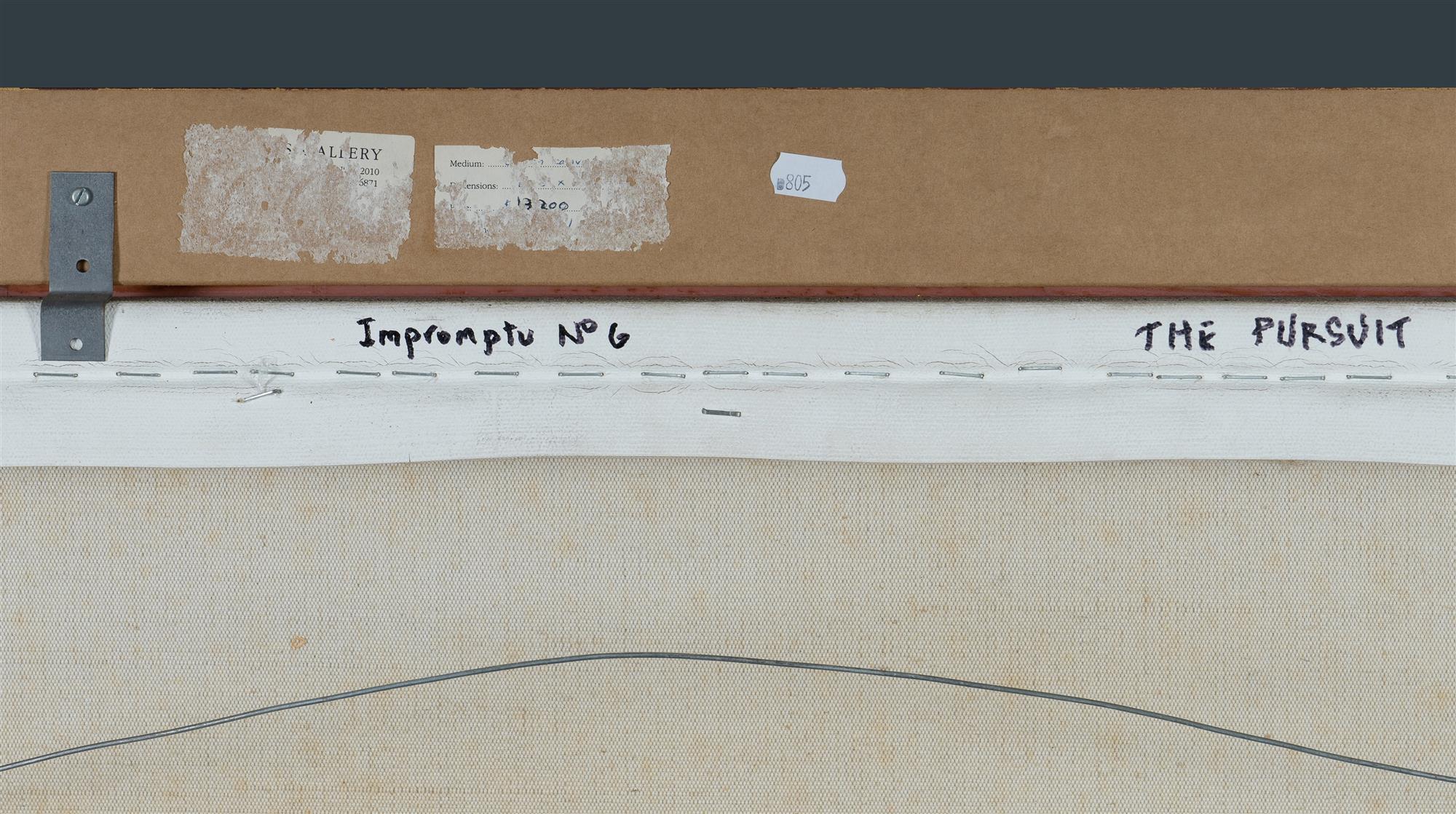 GLEESON, James (1915-2008) 'The Pursuit - Impromptu No. 6,' 1996. Oil on Canvas 63.5x80cm PROVENANCE: Watters Gallery, Sydney (label verso); private collection, Sydney.Estimate $5,000-8,000