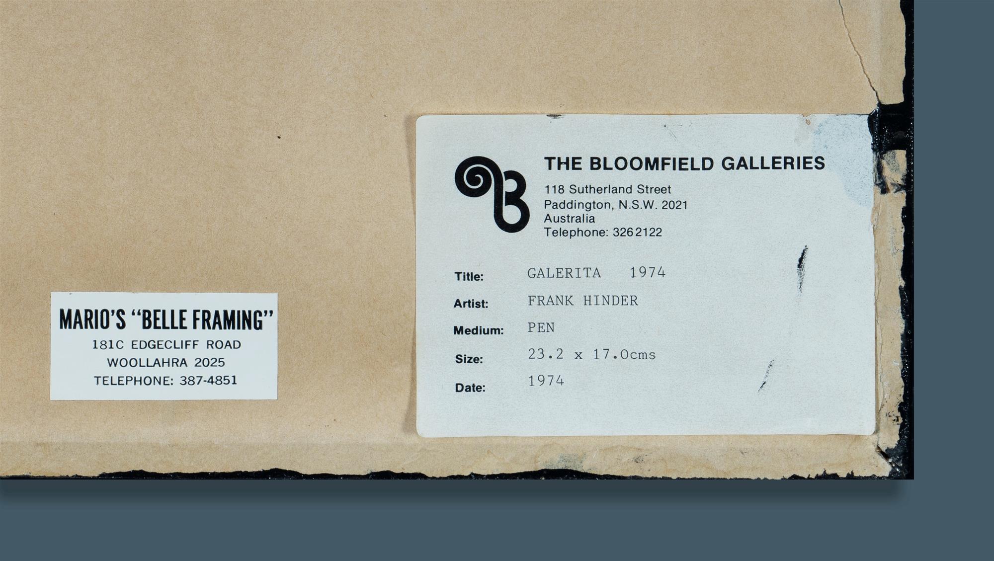 HINDER, F C (Frank) (1906-1992) 'Galerita,' 1974. The Bloomfield Galleries certificate of authenticity verso. Pen & Ink 23x17cm (sight)Estimate $500-800