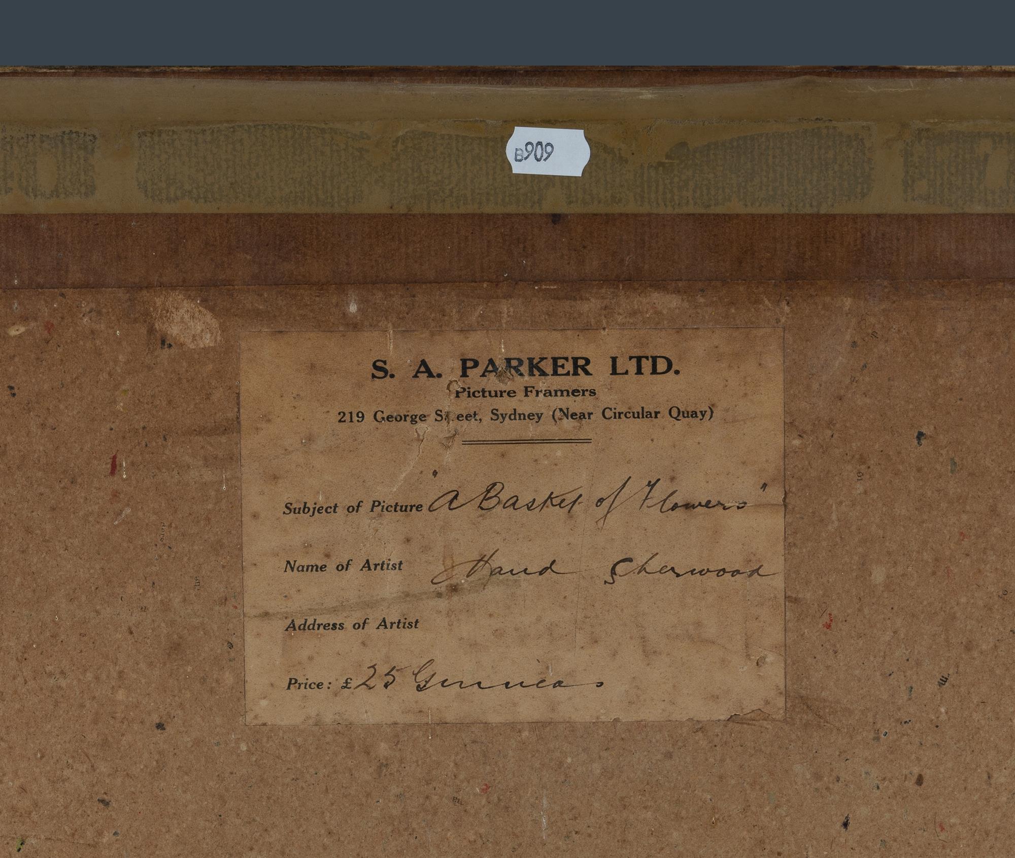 SHERWOOD, Maud (New Zealand 1880-1956) 'A Basket of Flowers' Original S.A. Parker Ltd label verso. W/Clr 32x39.5cmEstimate $400-700