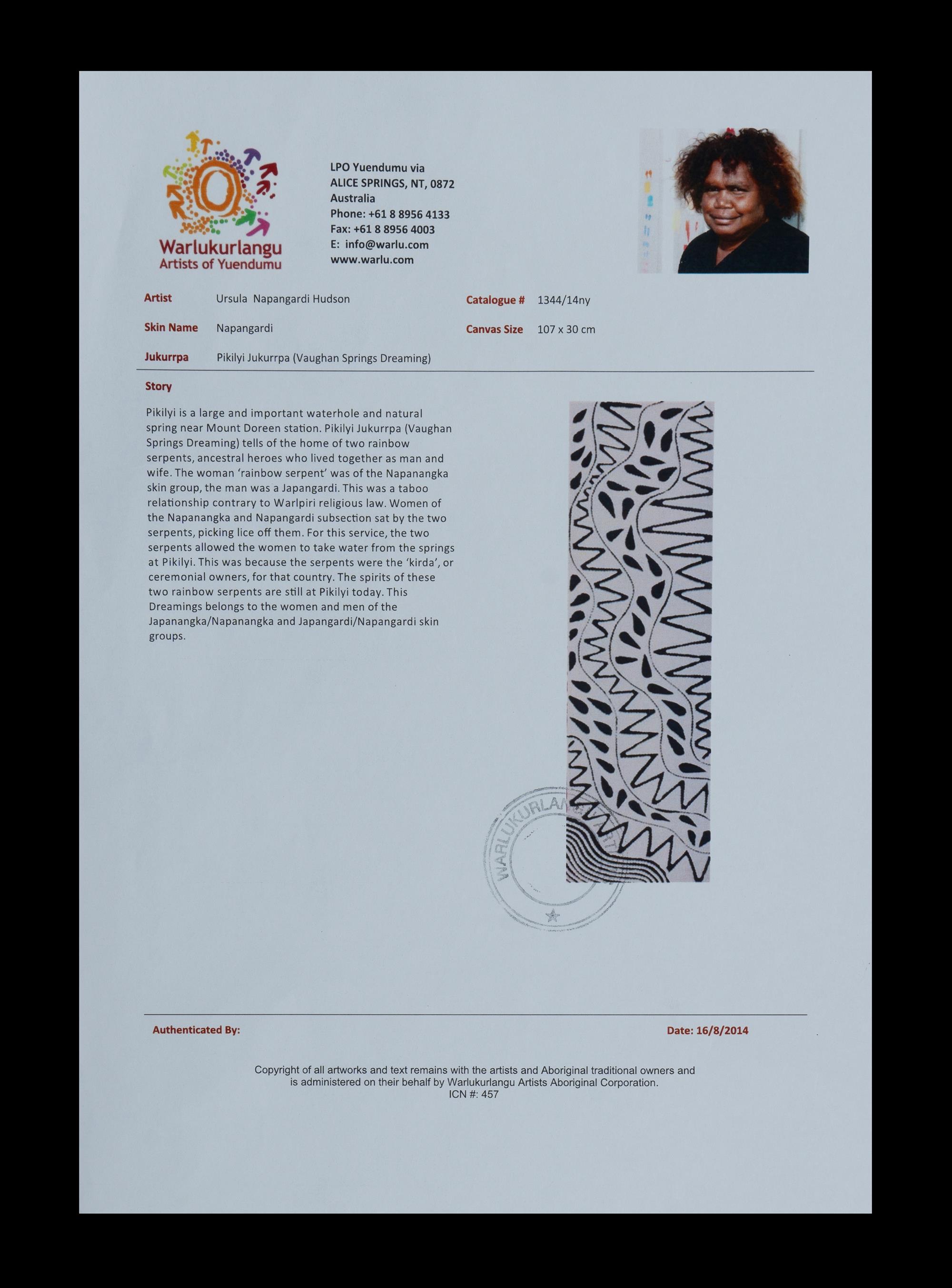 NAPANGARDI, Ursula Hudson (Aboriginal b.1962) 'Vaughan Springs Dreaming,' 2014. Warlukurlangu Artists cat #1344/14NY. Certificate of authenticity included. Acrylic on Linen 107x30cmEstimate $300-500