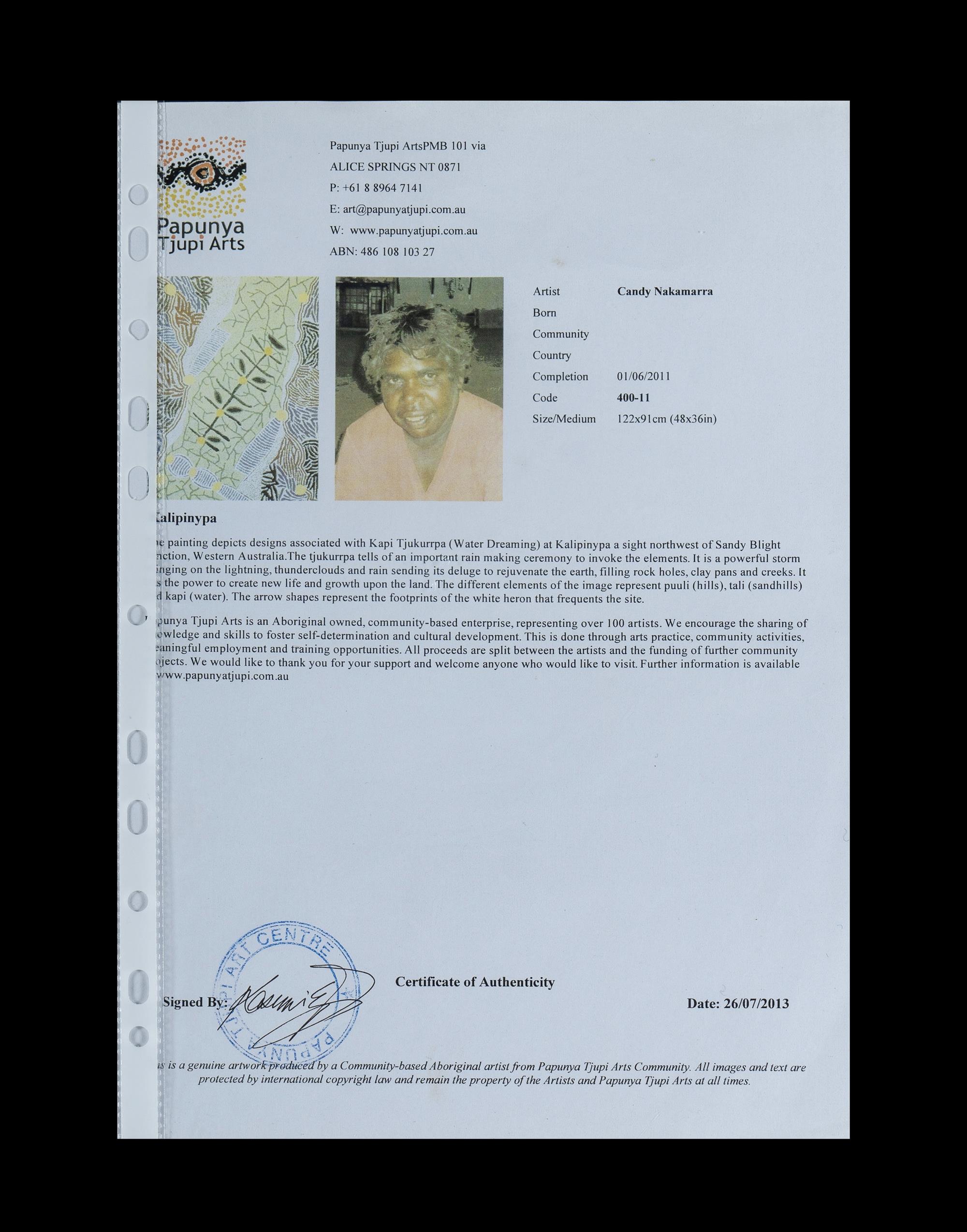 NAKAMARRA, Candy Nelson (Aboriginal b.1964) 'Kalipinypa Water Dreaming,' 2011. Papunya Tjupi Arts cat #4301/13. Certificate of authenticity included. Acrylic on Linen 122x91cmEstimate $600-1,000