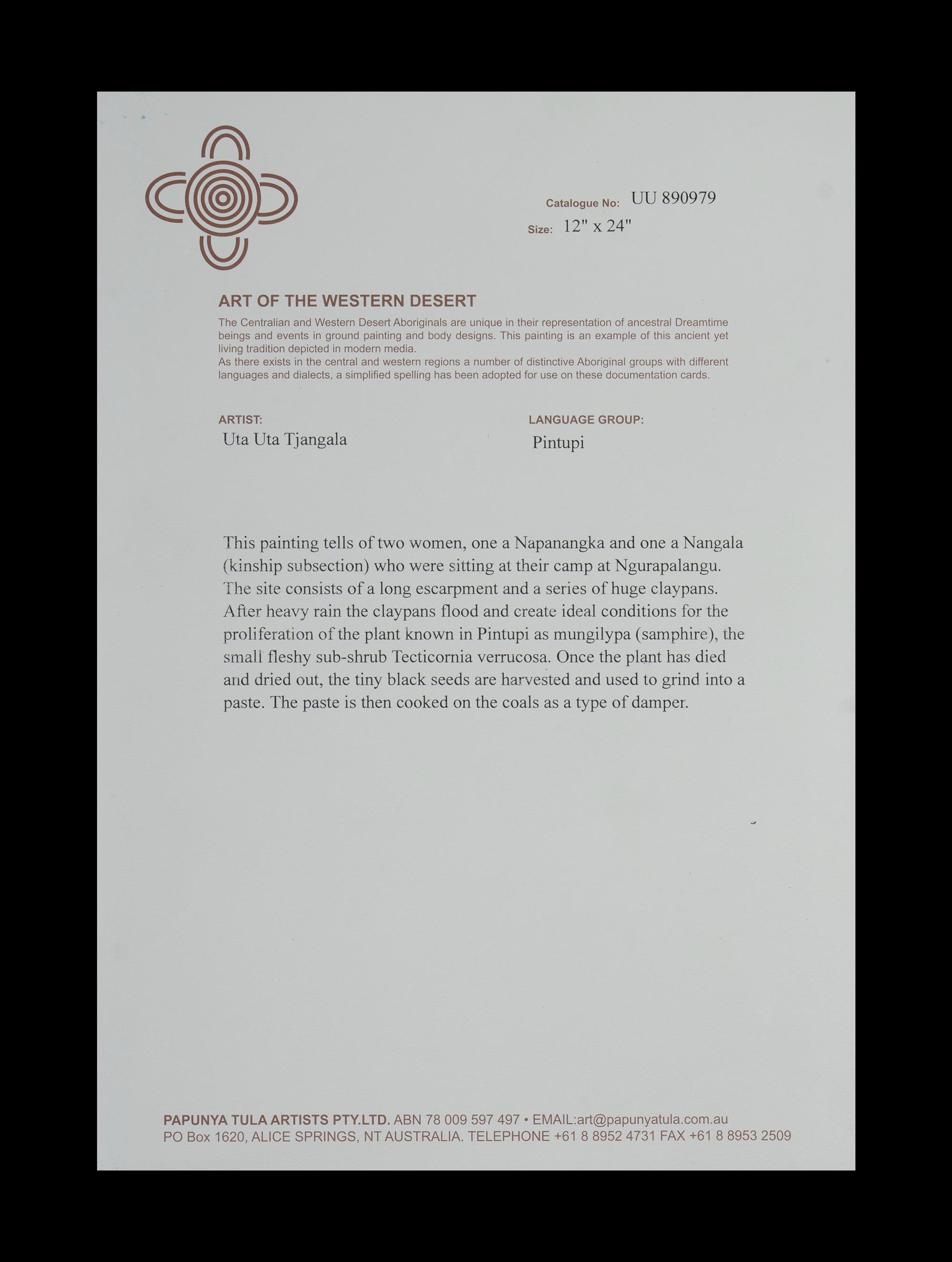 TJANGALA, Uta Uta (Aboriginal 1926-1990) Napanangka and Nangala Women Sitting at Camp at Ngurapalangu, 1989. Acrylic on Canvas Board 61x30.5cm PROVENANCE: Papunya Tula Artists, cat #UU890979 (certificate included)Estimate $2,000-3,000