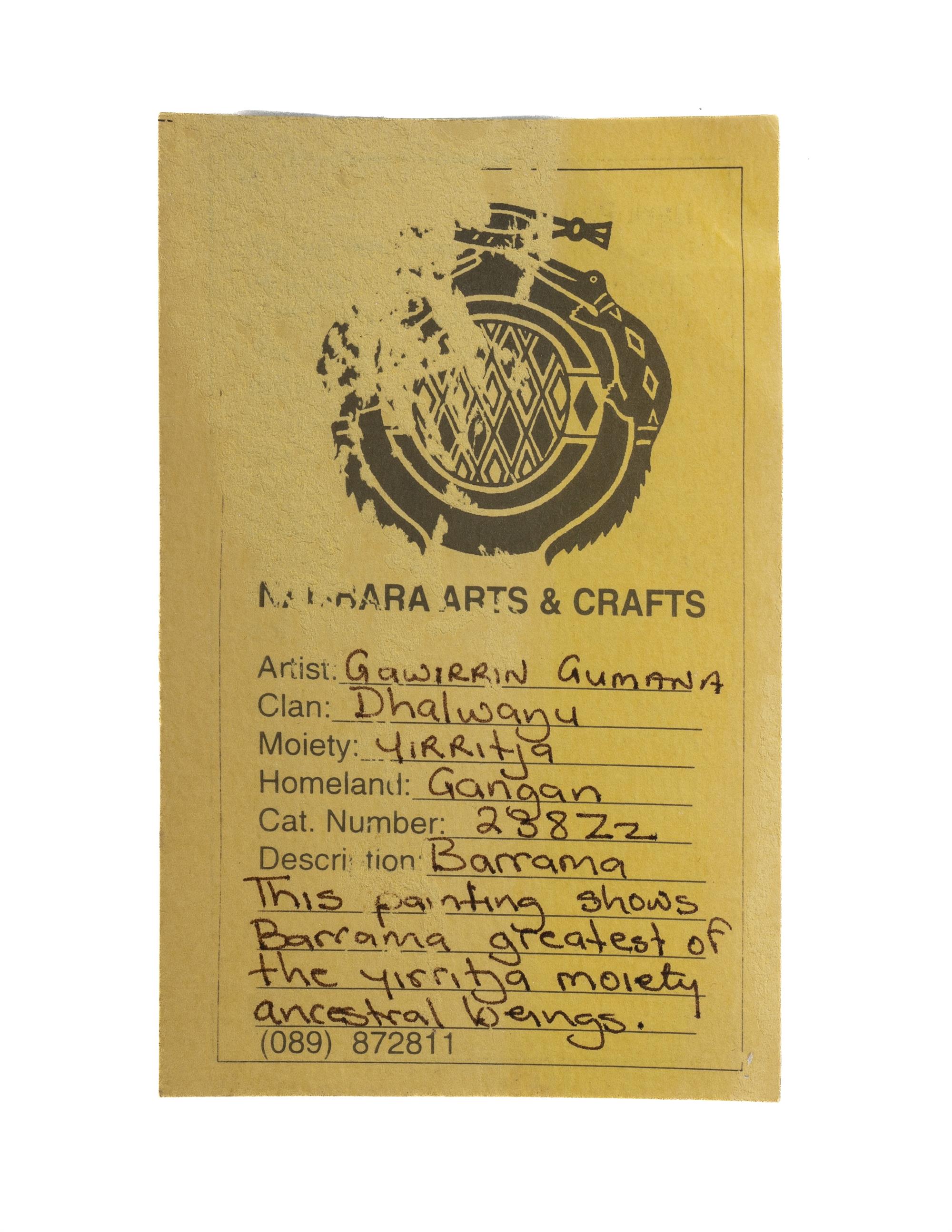 GUMANA, Gawirrin (Aboriginal b.1935) Untitled - Barrama, Greatest of the Yirritja Moiety Ancestral Beings Nambara Arts and Crafts label (cat #238zz or 23822) Natural Earth Pigments on Bark 66x39cmEstimate $400-800