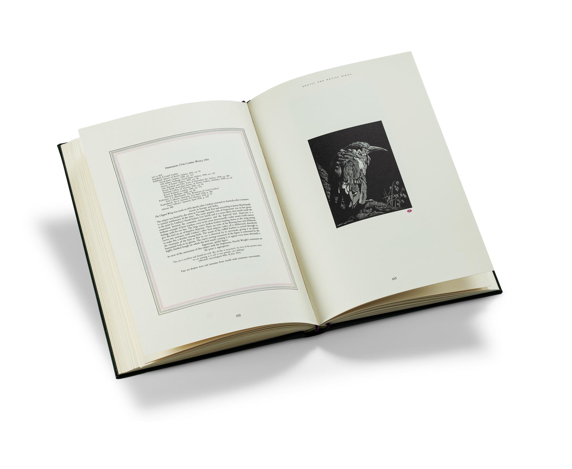 BOOK: 'The Art of Sir Lionel Lindsay,' Volume I: Woodcuts. Edition 260/300. Joanna Mendelssohn, pub Copperfield 1982. Signed by two directors. Leather bound edition with slipcase.Estimate $300-500