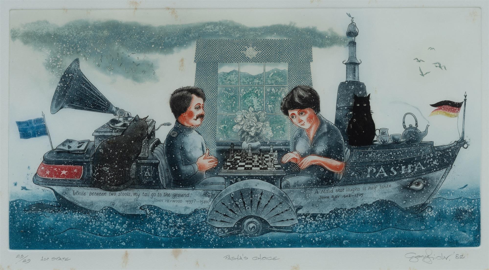 TRICKER, Gary (New Zealand b.1938) (3) 'Pasha's Choice,' 1982, 1st State 25/25 (21x42cm); 'Pasha's Dream,' 1984, 26/30 (25x37cm); and 'The Hobbit,' 1989, 42/50 (26.5x26cm) Colour Etching (3)