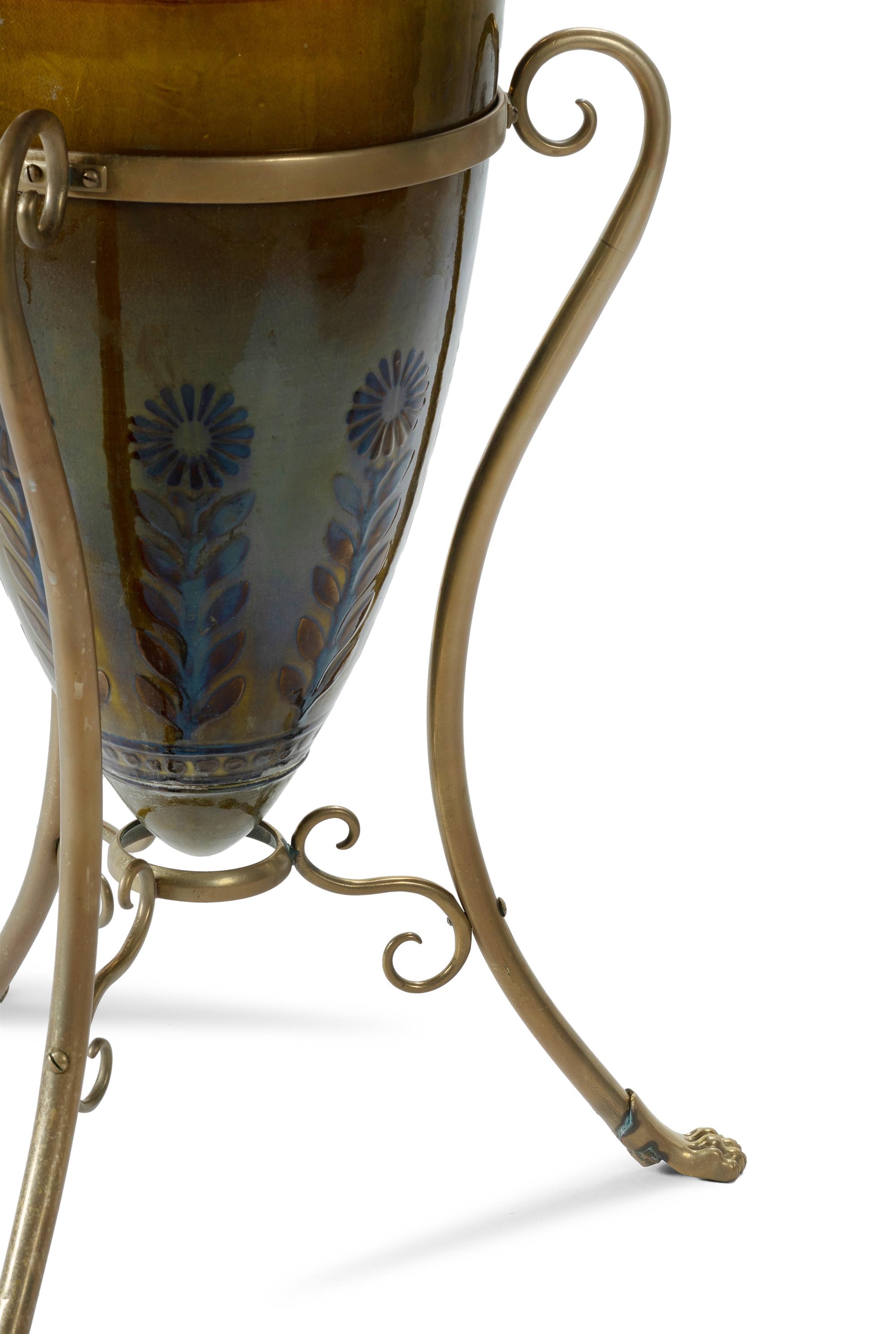 English Aesthetic Movement Slip Decorated Amphora Floor Vase. In brass stand c.1880, in the style of E.W Godwin and Christopher Dresser. Green and yellow colourway. (H84cm)Estimate $300-600