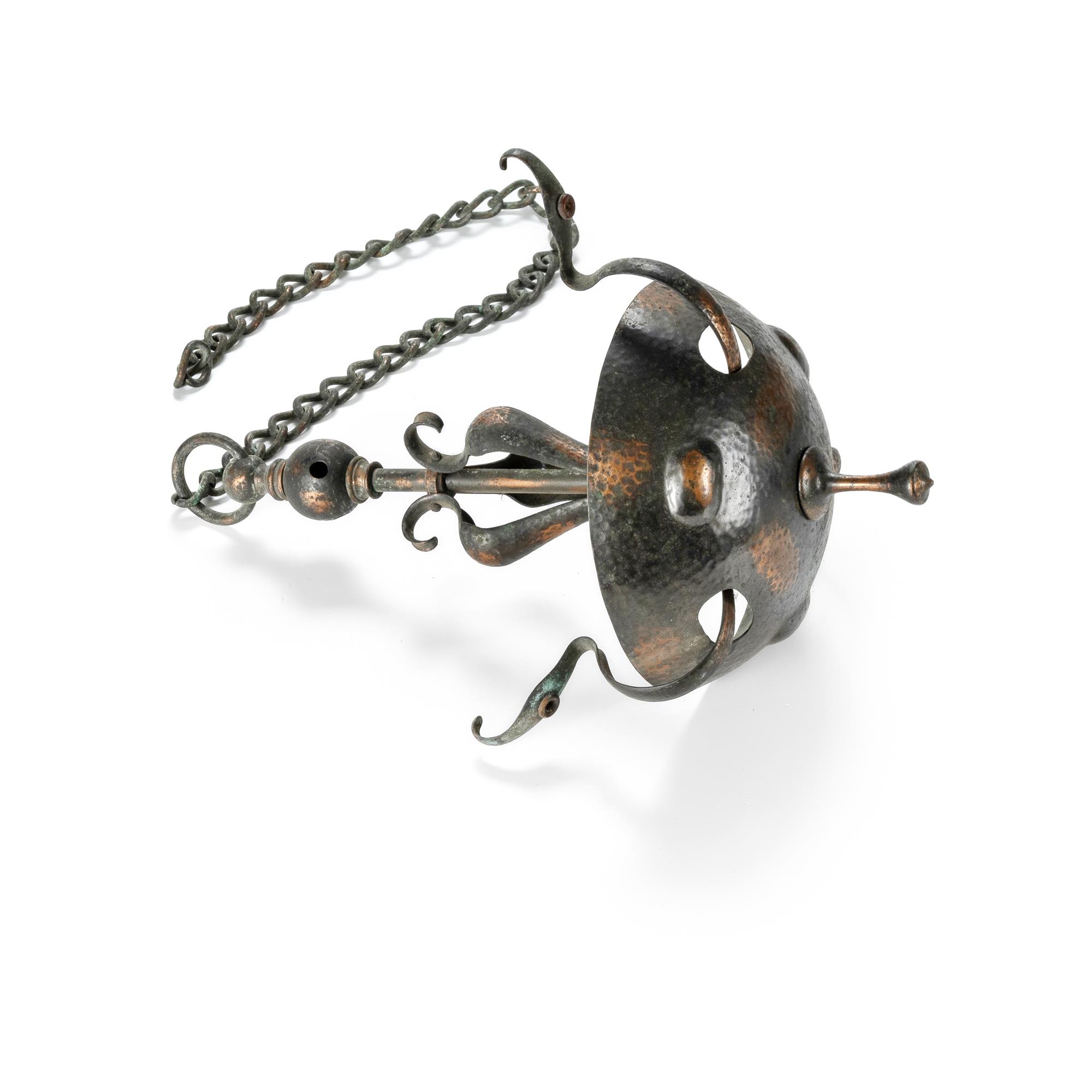 British Arts & Crafts Hammered Copper 3 Branch Hanging Pendant Electrolier. Early 20th C. Unwired. H45cm (approx.)Estimate $50-100