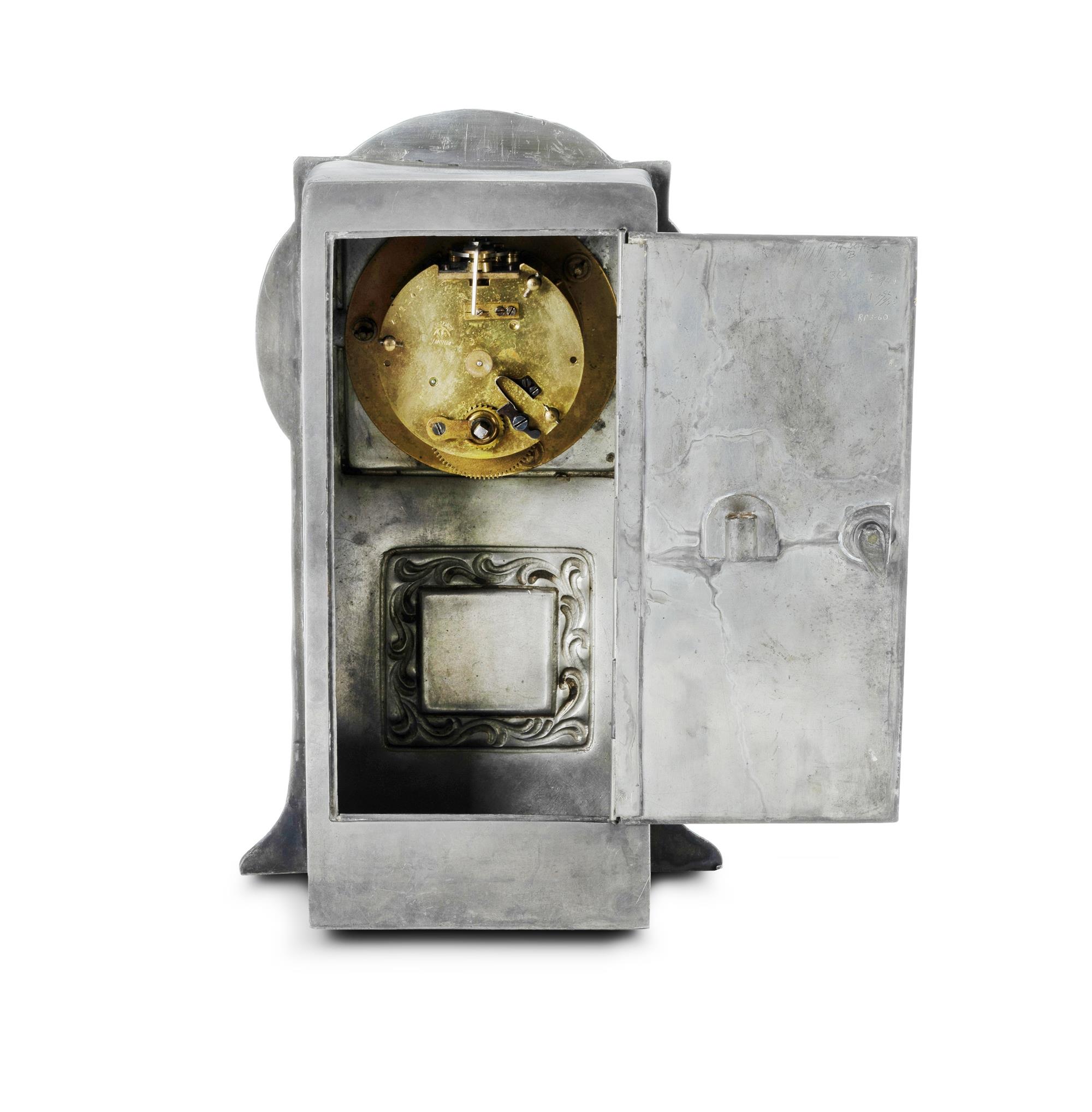 Liberty & Co. 'Tudric' Pewter Table Clock. Model no. 0383 with copper face inset with enamel plaque (probably by F.C. Varley) circa 1905. Original Lenzkirch movement, and hands, lacking key, not running. (H25cm)Estimate $500-1,000