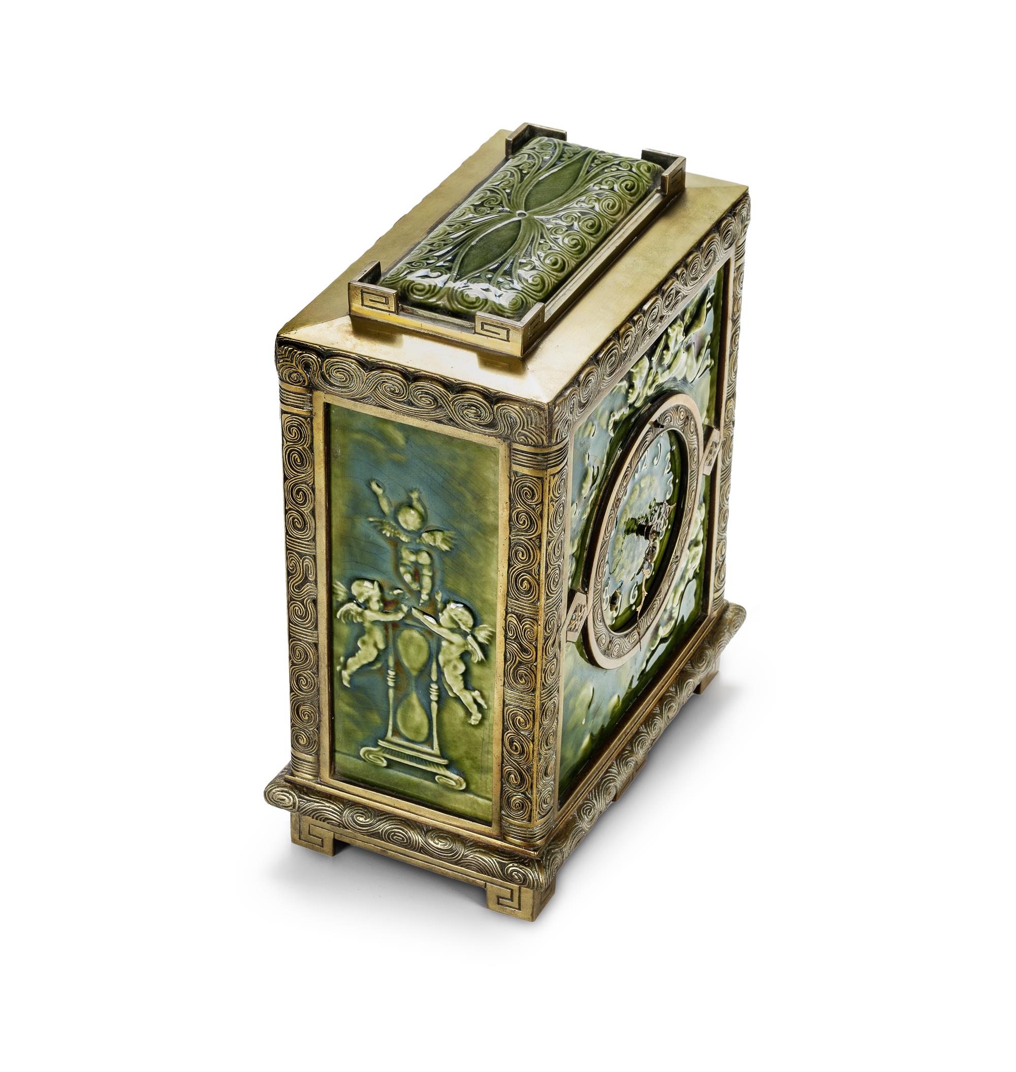 J.G. Low Art Tile and New Haven Clock Co. Brass Mounted 'Albatross' Pattern Mantle Clock circa 1880s. Lacks pendulum or key. (H31cm)Estimate $1,000-2,000