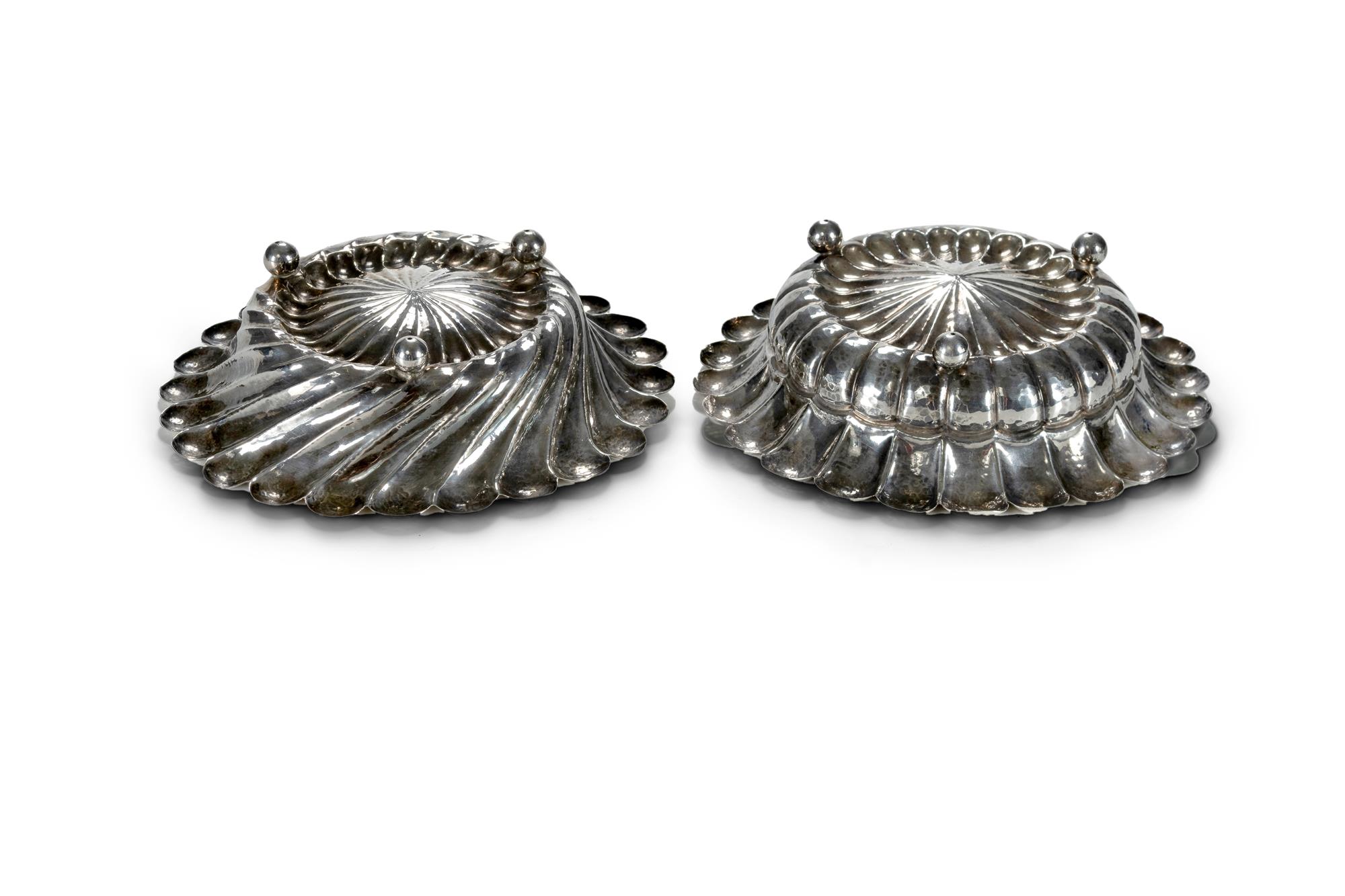 Pr Austrian Secessionist Hand Wrought Silver Bowls. With martele finish and ball feet. Unmarked. Dia.18.5cm W400g (total)Estimate $200-600