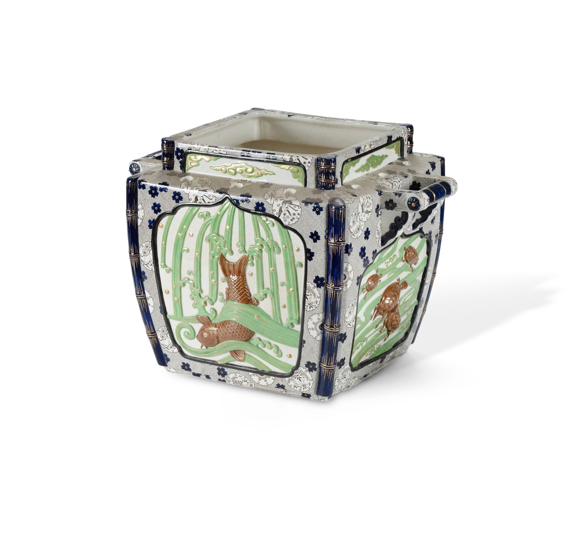 Attrib. Christopher Dresser, a Very Large Minton Aesthetic Movement 'Aquatic Life' Jardiniere. Shape no. 215 with date cypher for 1878. Lacking feet, star crack to base. Reference: Met Museum (online) accession no. 1995.273 for an identical model with monotone glaze. (H40cm W54cm across handles).