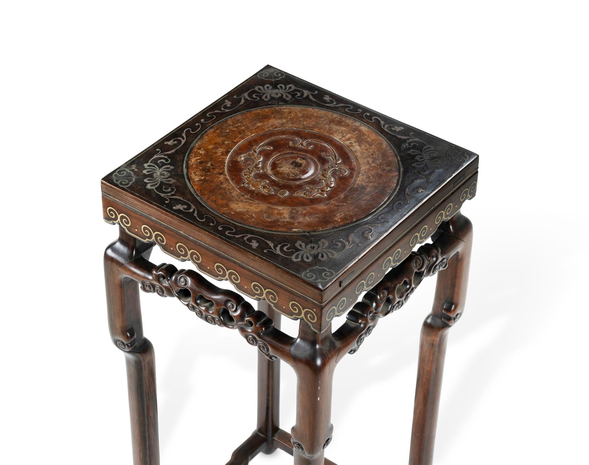Chinese Hongmu Rosewood and Brass Inlaid Incense Stand. With dragon carved burlwood top panel, the aprons carved with lingzhi, early 20th C. (H81cm)Estimate $400-800