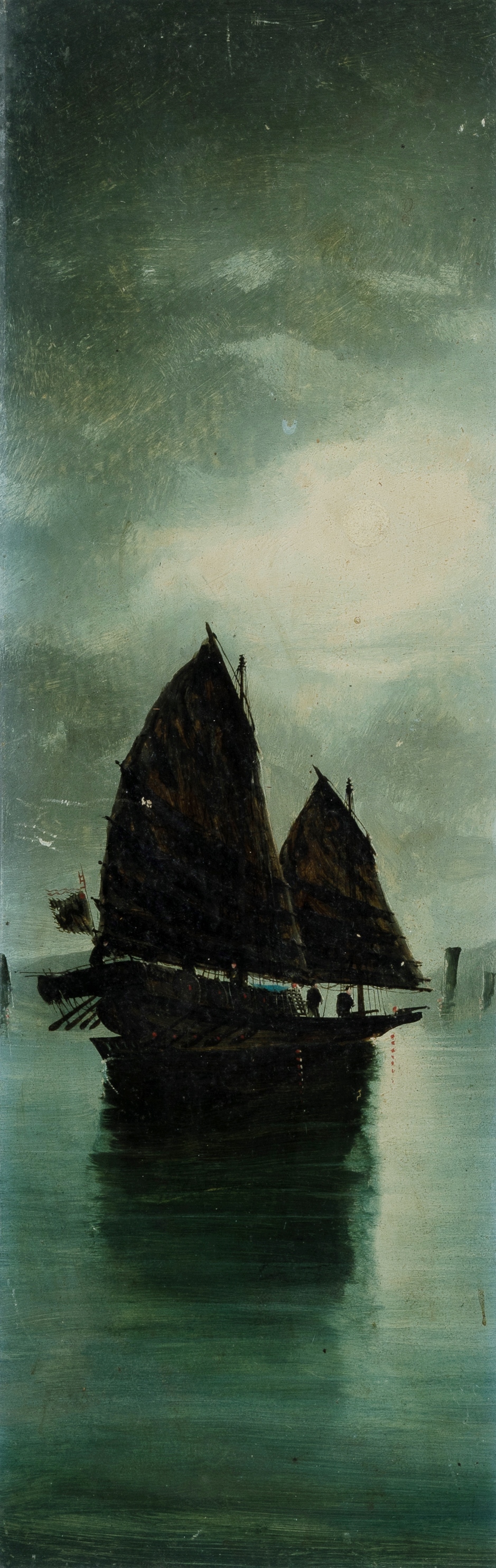 YEE CHEONG, (Hong Kong/Chinese) (2) Junks in Harbour, Day and Night Original printed artist's labels verso. Oil (2) 50x16cm each (image)Estimate $200-300