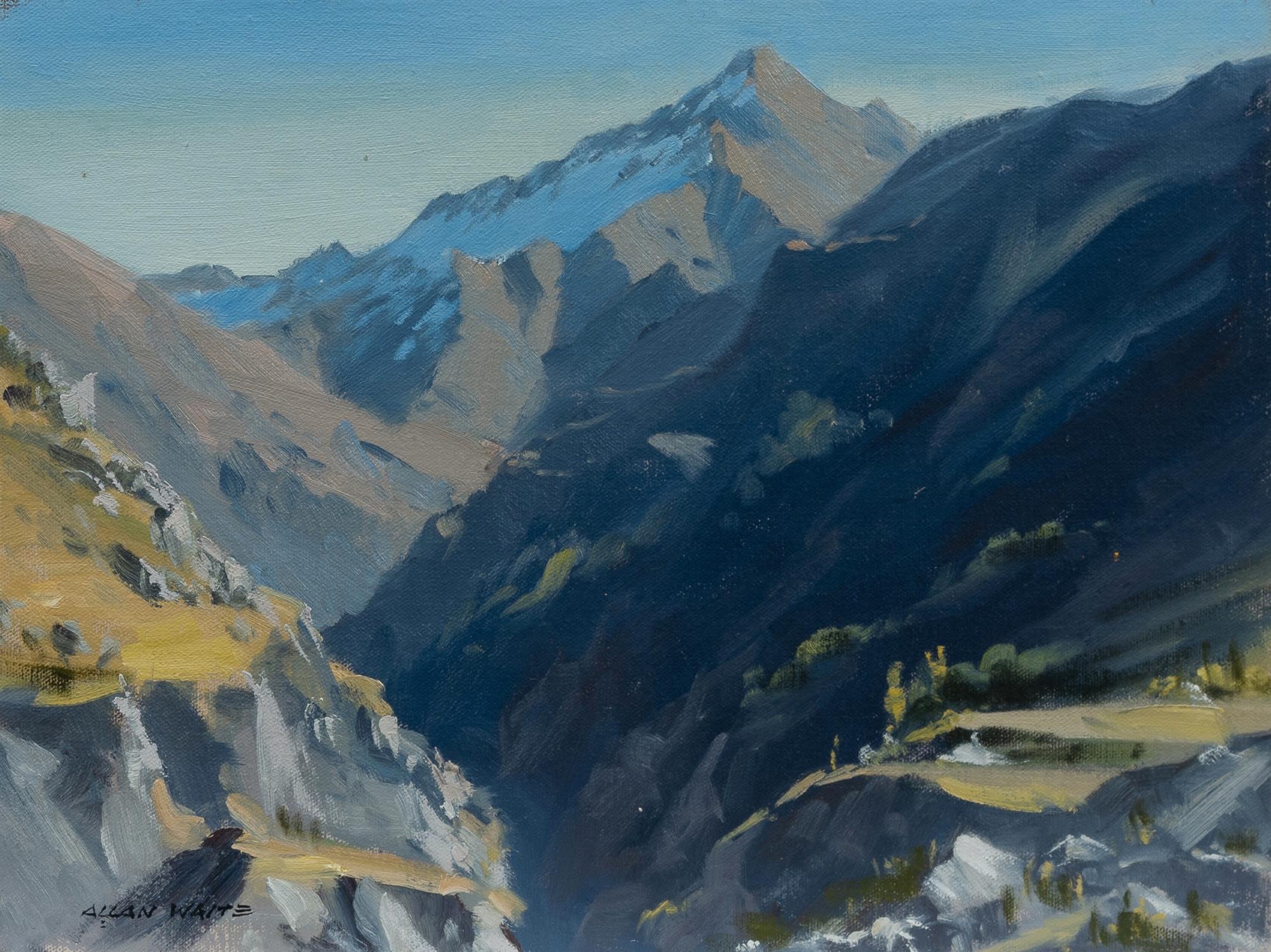 WAITE, Allan (1924-2010) (2) 'Mt Aurum' (from Skippers Canyon, Central Otago, NZ 1982) (30x40cm); and 'Chasm Near Glendhu, Wanaka Area, NZ' (46x36cm) Oil on Canvas Board (2)Estimate $80-120