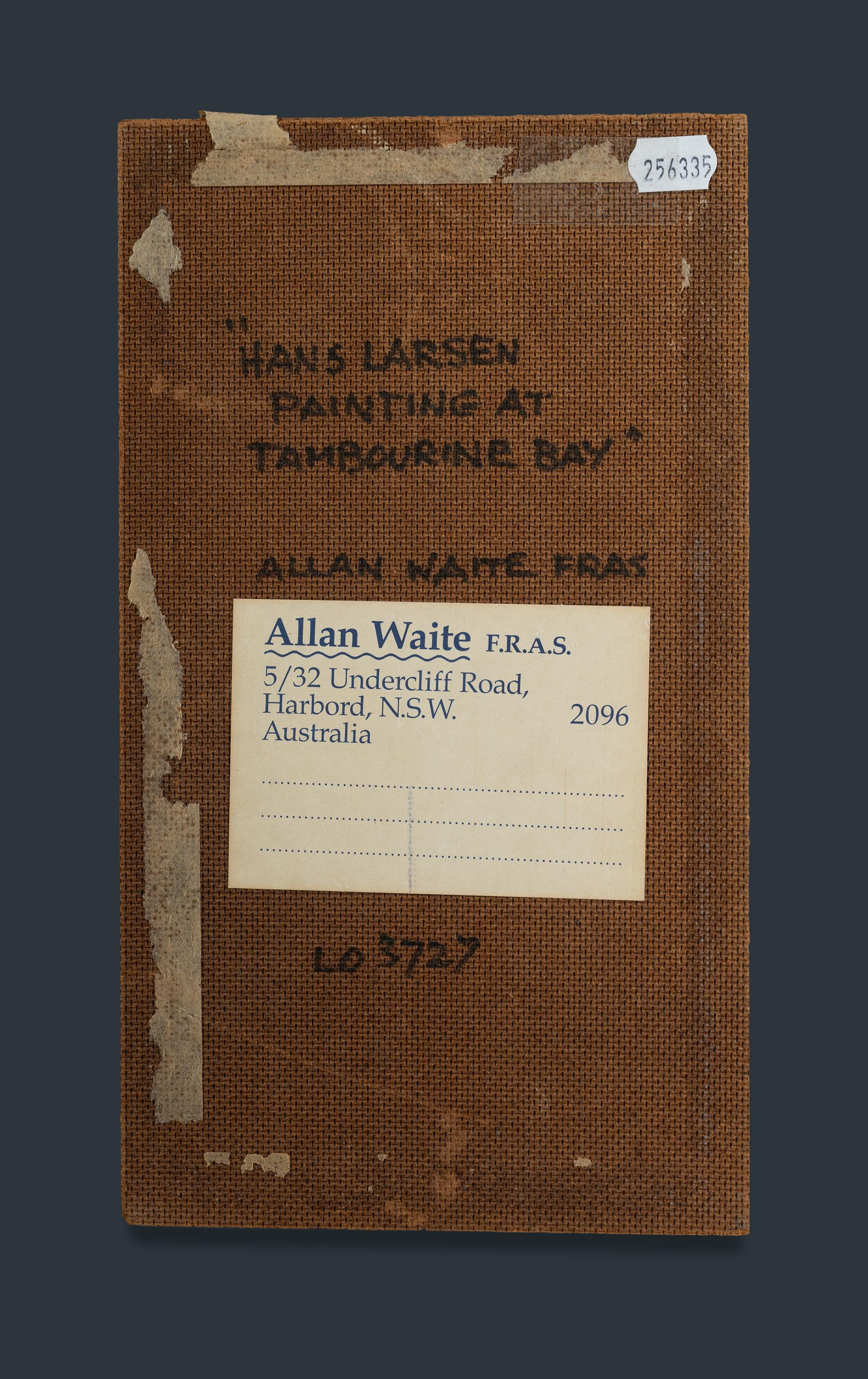 WAITE, Allan (1924-2010) 'Hans Larsen Painting at Tambourine Bay [NSW]' Signed lower left; artist label and inscribed verso. Oil on Canvas on Board 23x13cm PROVENANCE: Family of the Artist.Estimate $60-120