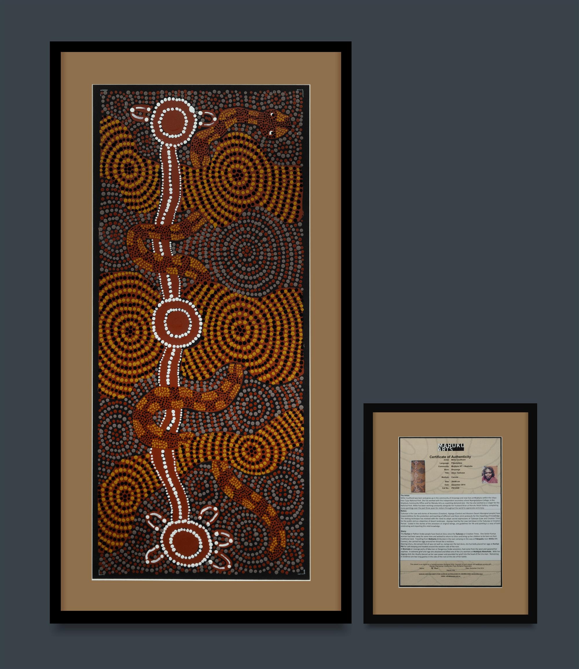 COULTHARD, Millie (Aboriginal School) 'Uluru Tjukurpa,' 2014. Acrylic on Canvas 90x38cm PROVENANCE: Maruku Arts, NT, cat #PN13348 (framed certificate included); Estate Late Larry Shaw, Cowra NSW.Estimate $300-500
