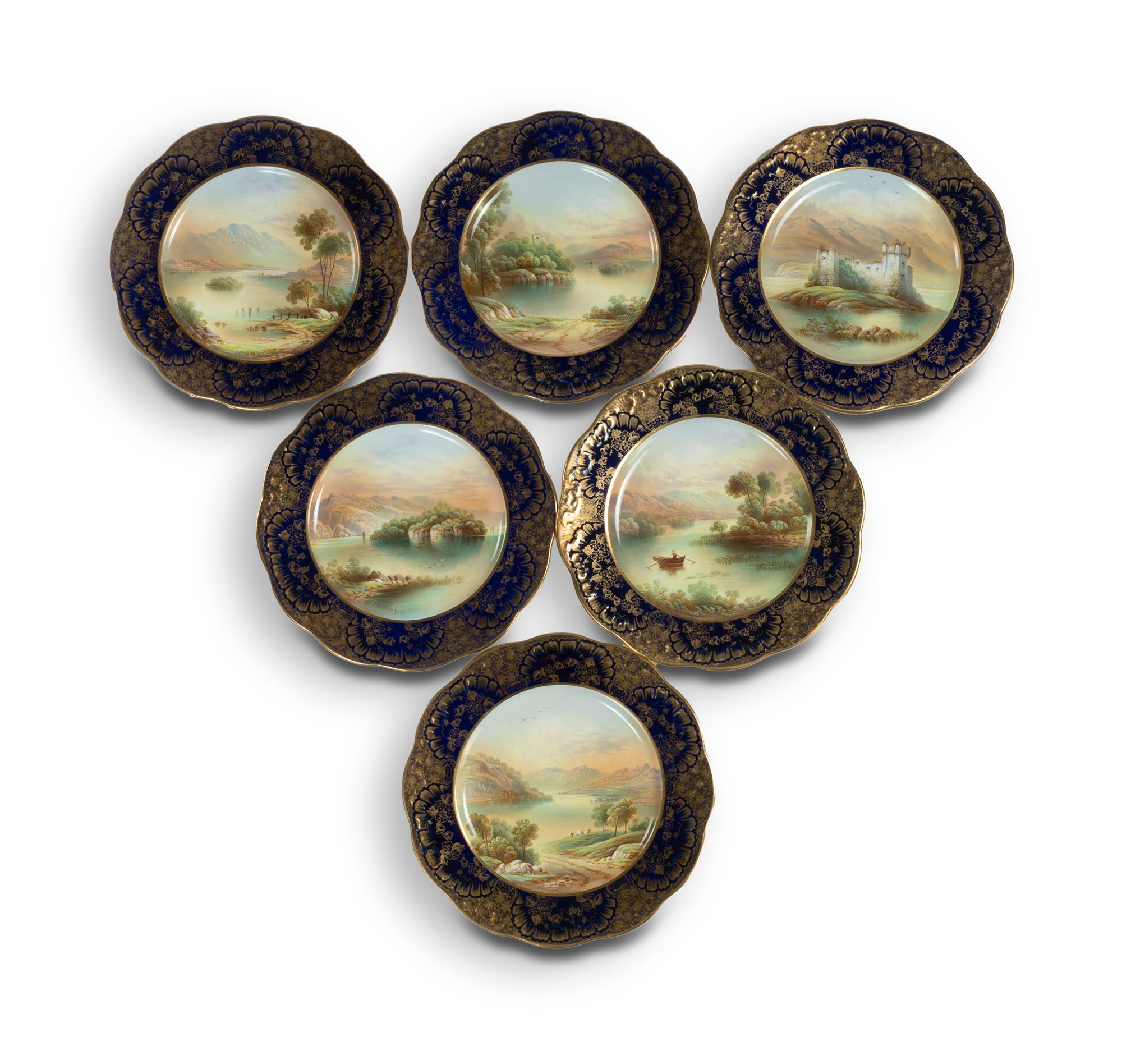 Set of 12 Aynsley Cobalt Ground Plates Hand-painted scenes of Scottish castles and lochs, signed F. Micklewright. (Dia.21cm)