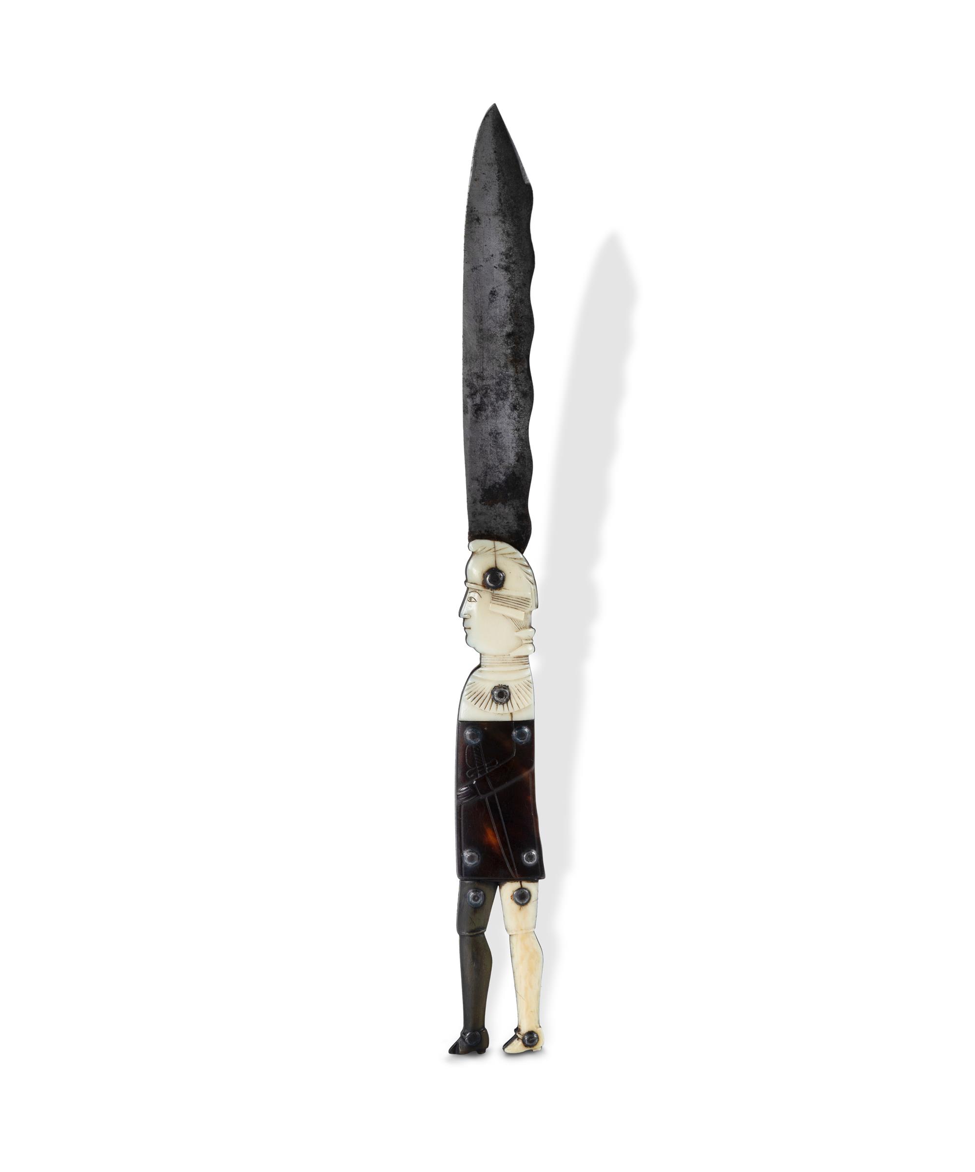 Rare 18th C American Revolutionary War Folding Knife Figural knife 'Hessian soldier' with bone and horn slab grips. L26cm (extended) PROVENANCE: From the collection of the late Warren MallardEstimate $800-1,500